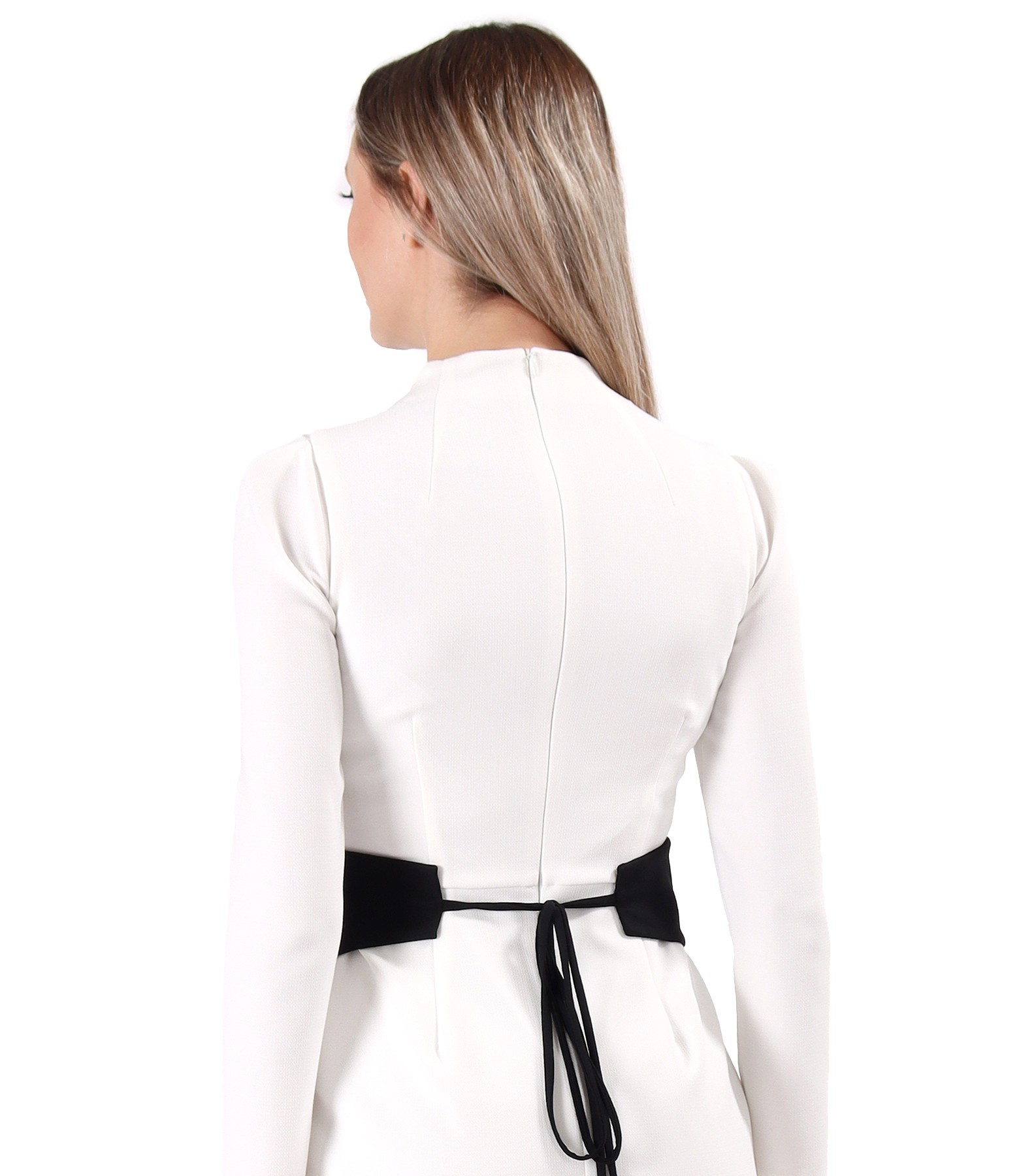 Adjustable cord made of elastic fabric with viscose, rectangular shape, doubled with the same fabric. It fastens at the back with lace from the same fabric. The total length of the cord, with lace from the same fabric, is 240 cm.