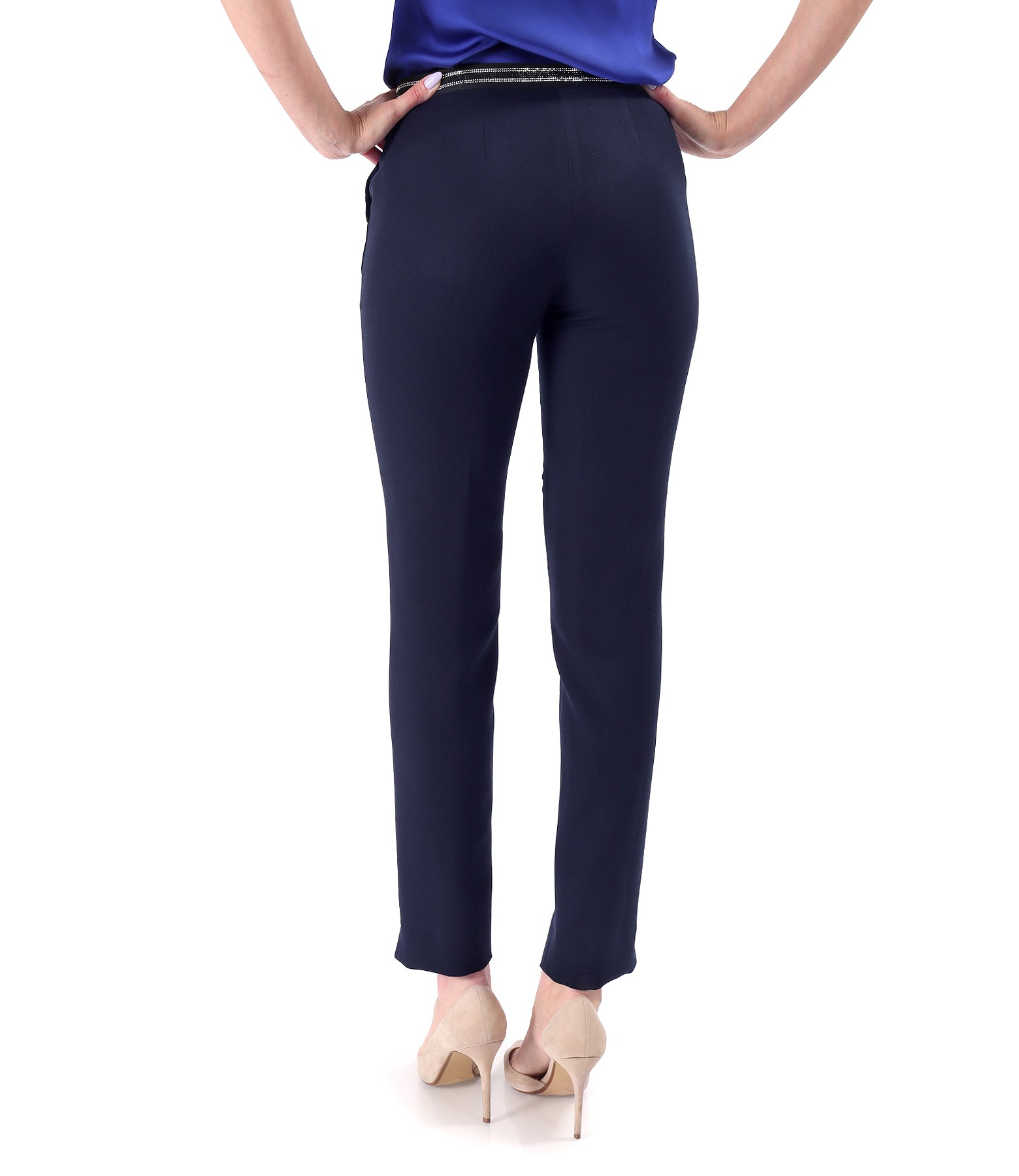 Ankle pants made of elastic viscose fabric, with a stripe sewn on the front, side pockets, and elastic at the waist. It closes with a normal zipper, counter-button, and 2 staples on the front.