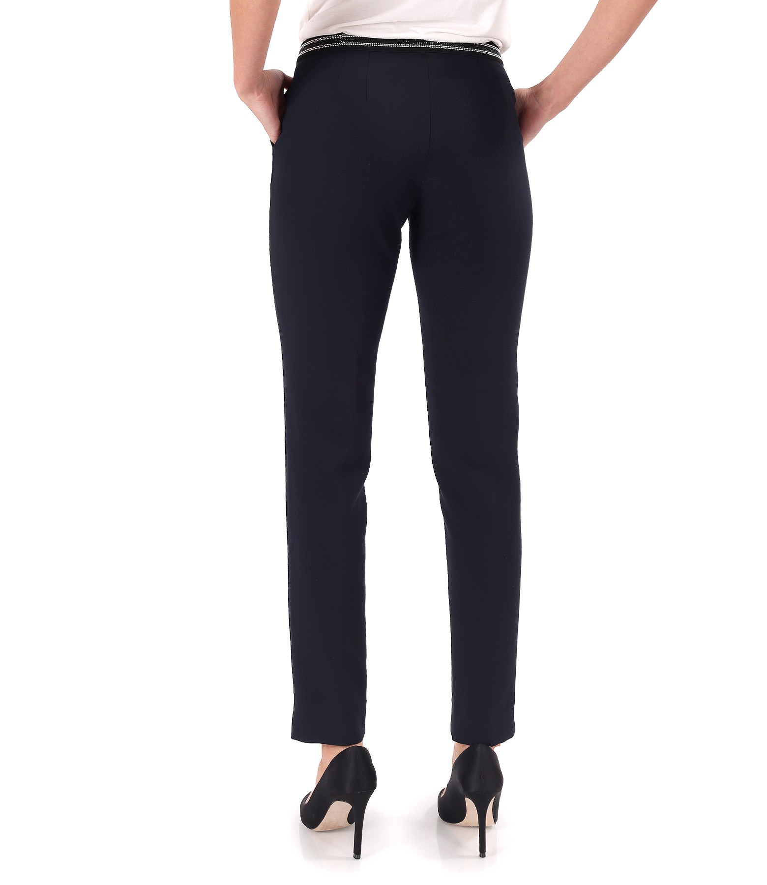 Ankle pants made of elastic viscose fabric, with a stripe sewn on the front, side pockets, and elastic at the waist. It closes with a normal zipper, counter-button, and 2 staples on the front.