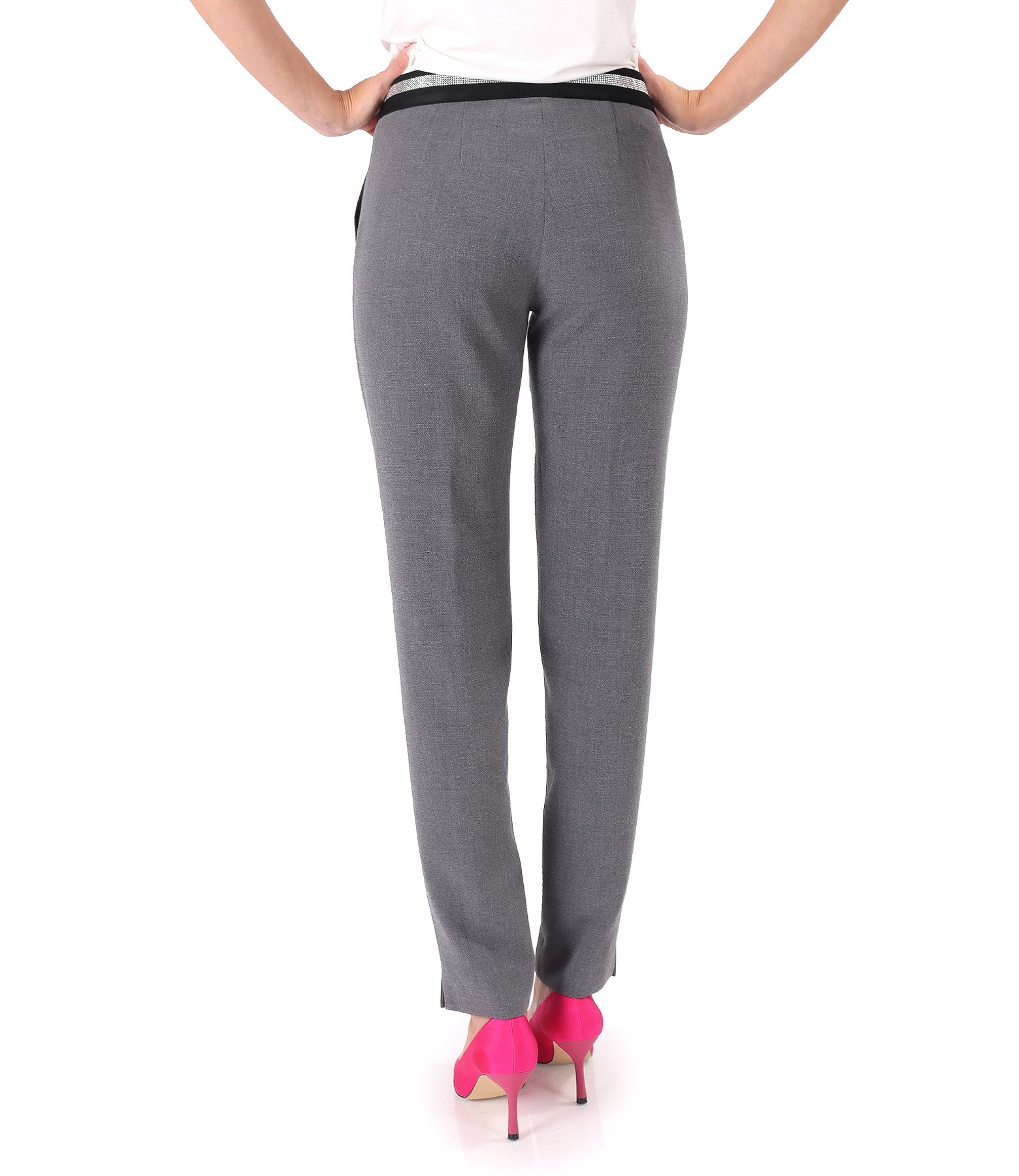 Ankle pants made of elastic viscose fabric, with a stripe sewn on the front, side pockets, and elastic at the waist. It closes with a normal zipper, counter-button, and 2 staples on the front.