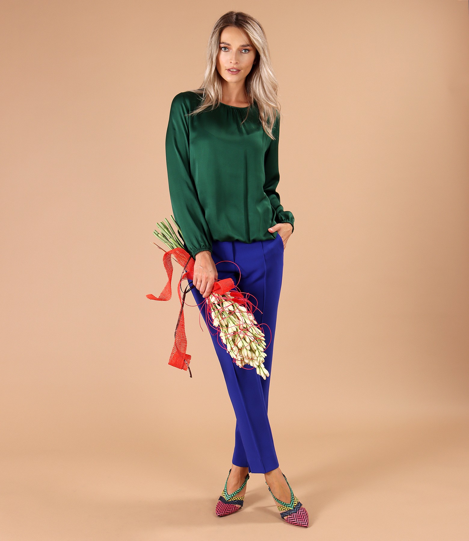 Ankle pants made of elastic viscose fabric, with a stripe sewn on the front, side pockets, and multi-colored elastic at the waist. It closes with a normal zipper, counter-button, and 2 staples on the front.