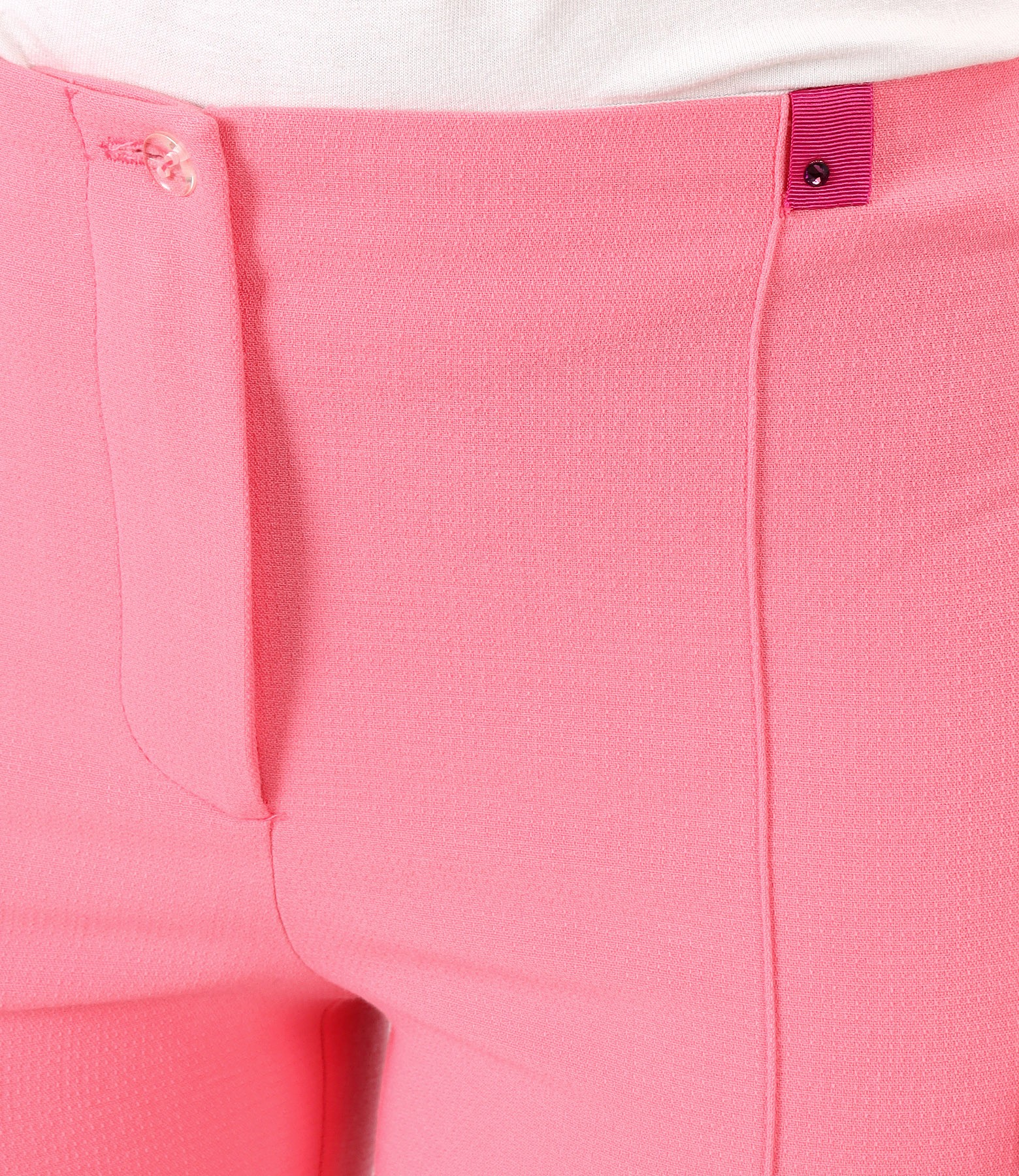 Ankle pants made of elastic fabric, with elastic at the waist and a stripe sewn on the face. It closes with a zipper and a button on the face.