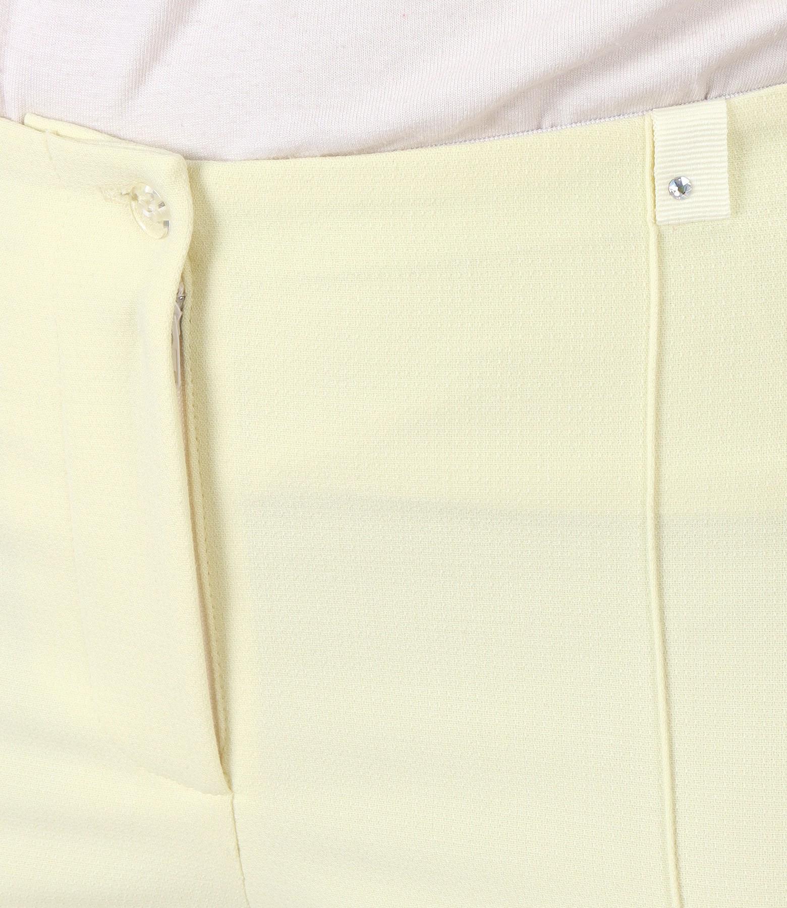 Ankle pants made of elastic fabric, with elastic at the waist and a stripe sewn on the face. It closes with a zipper and a button on the face.