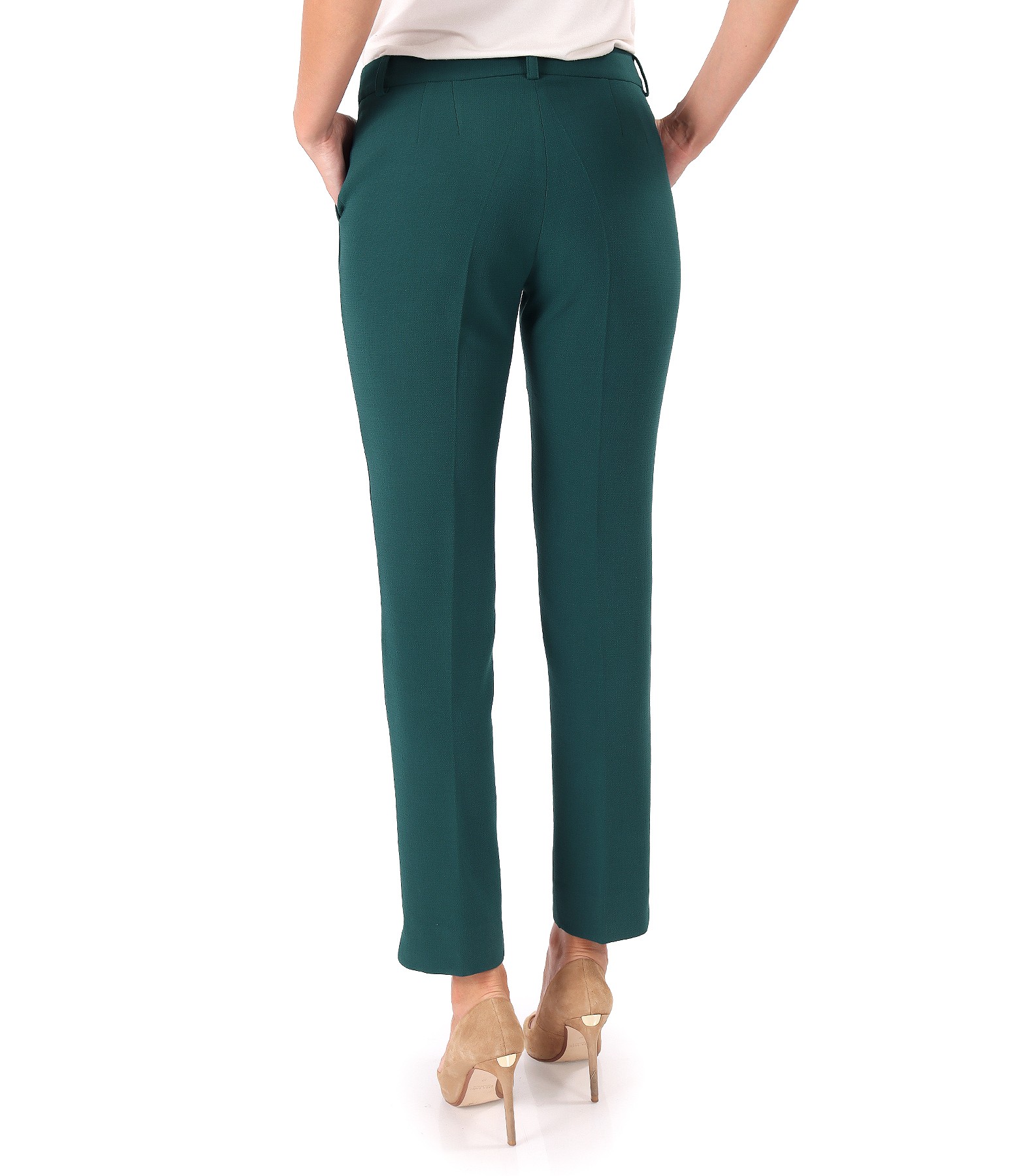 Ankle pants made of elastic fabric, with sewn stripe, waist belt and oblique side pockets. Closes with normal zipper, a button and 2 front staples.