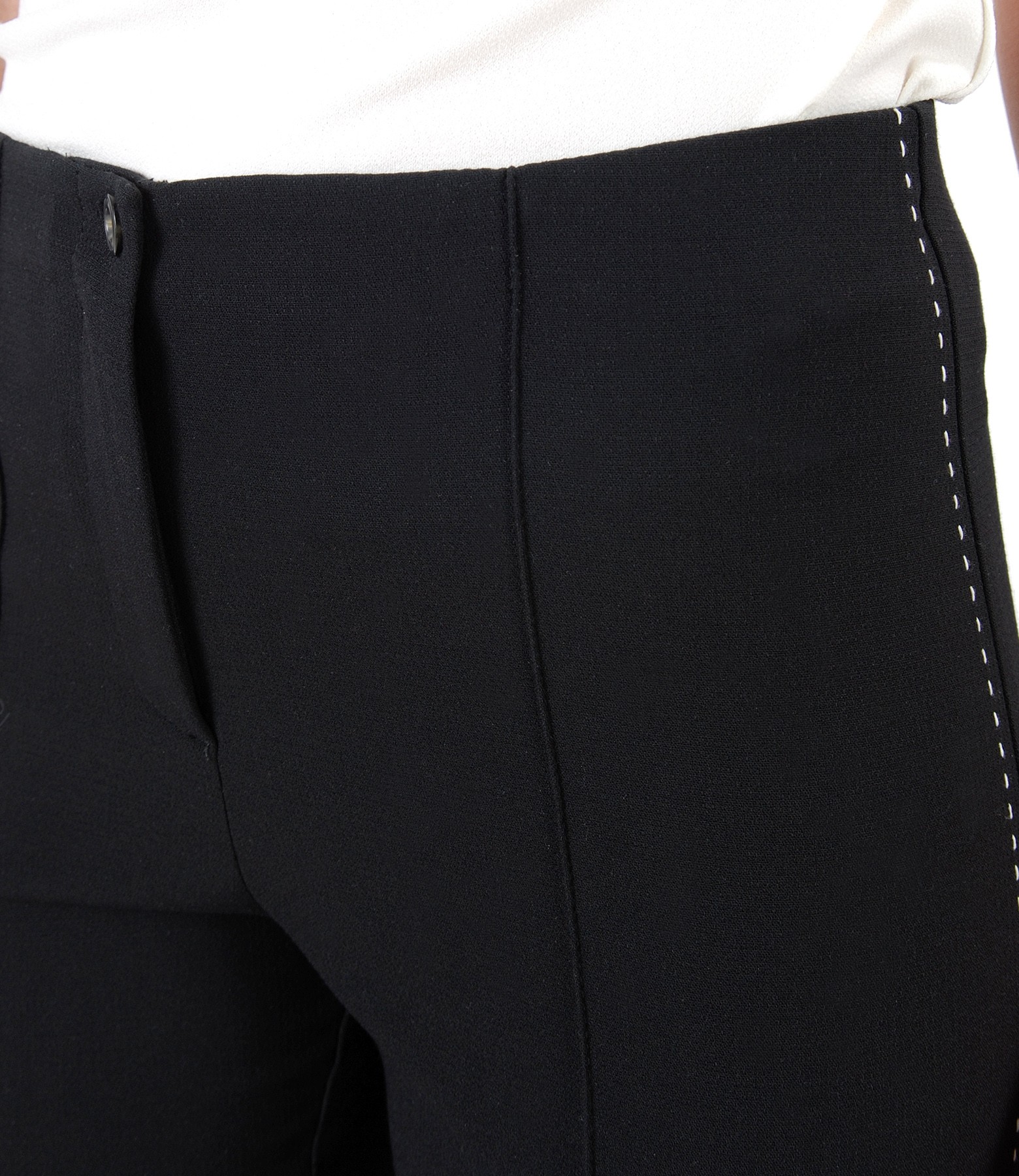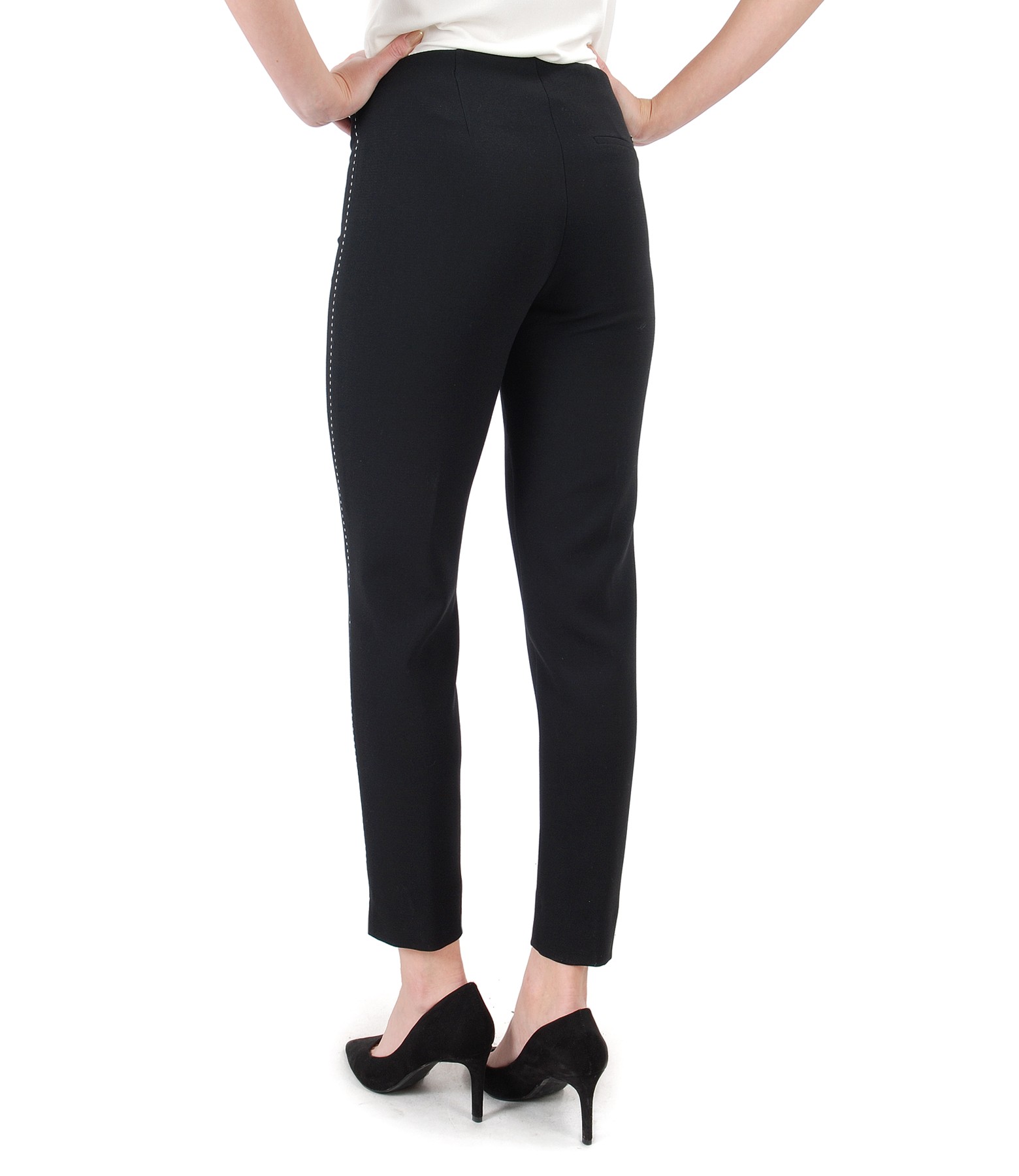 Ankle pants made of elastic fabric with side seam, with elastic waist. Closes with zipper and front button.