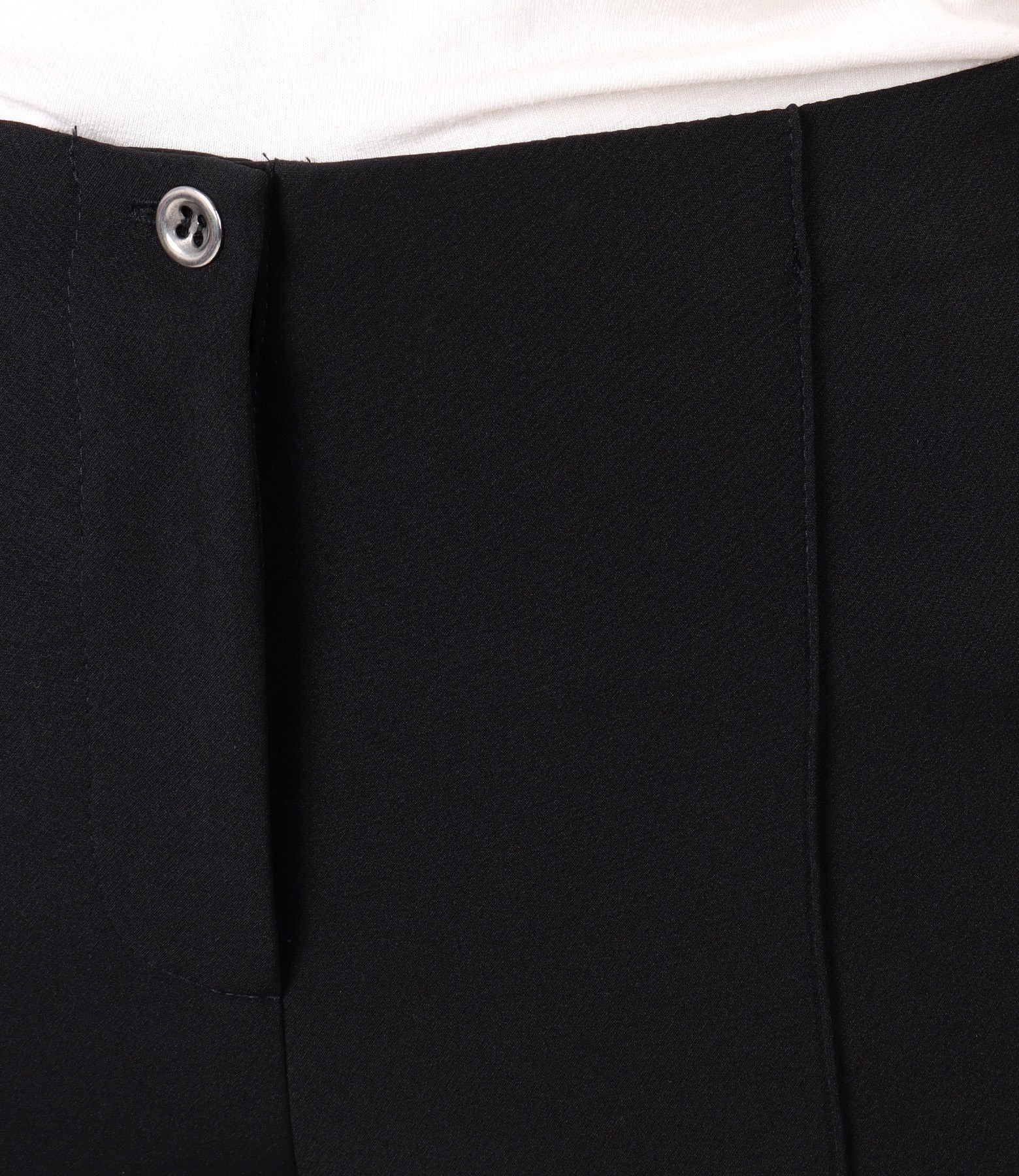 Ankle pants made of elastic fabric, with elastic at the waist and a stripe sewn on the face. It closes with a zipper and a button on the face.
