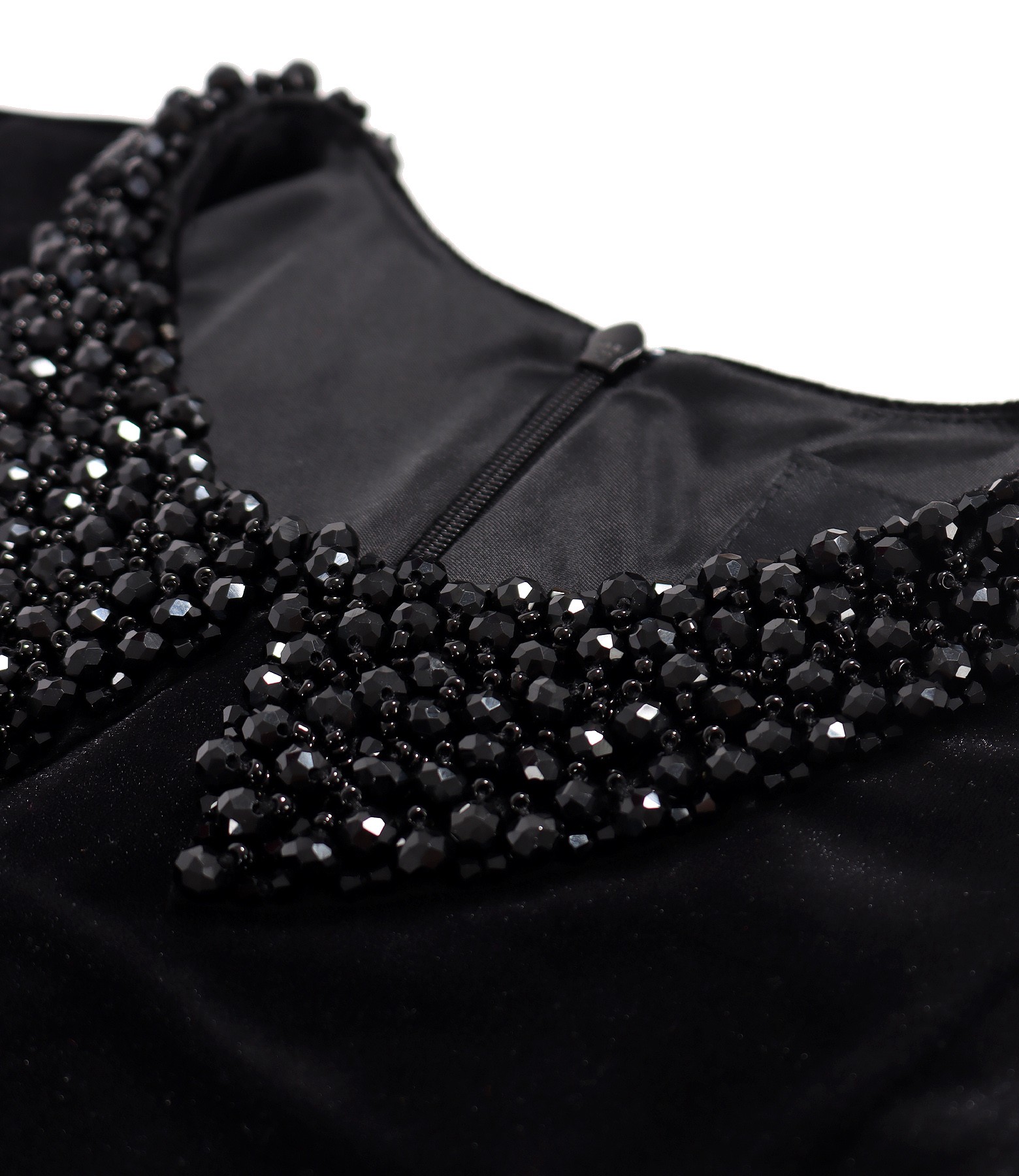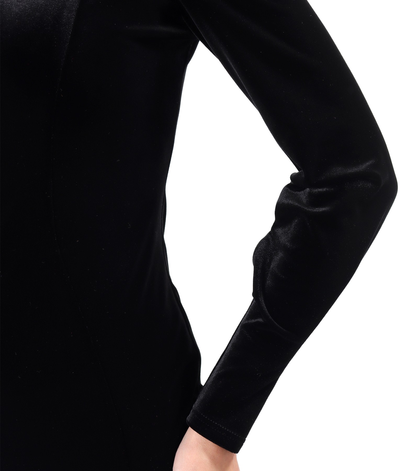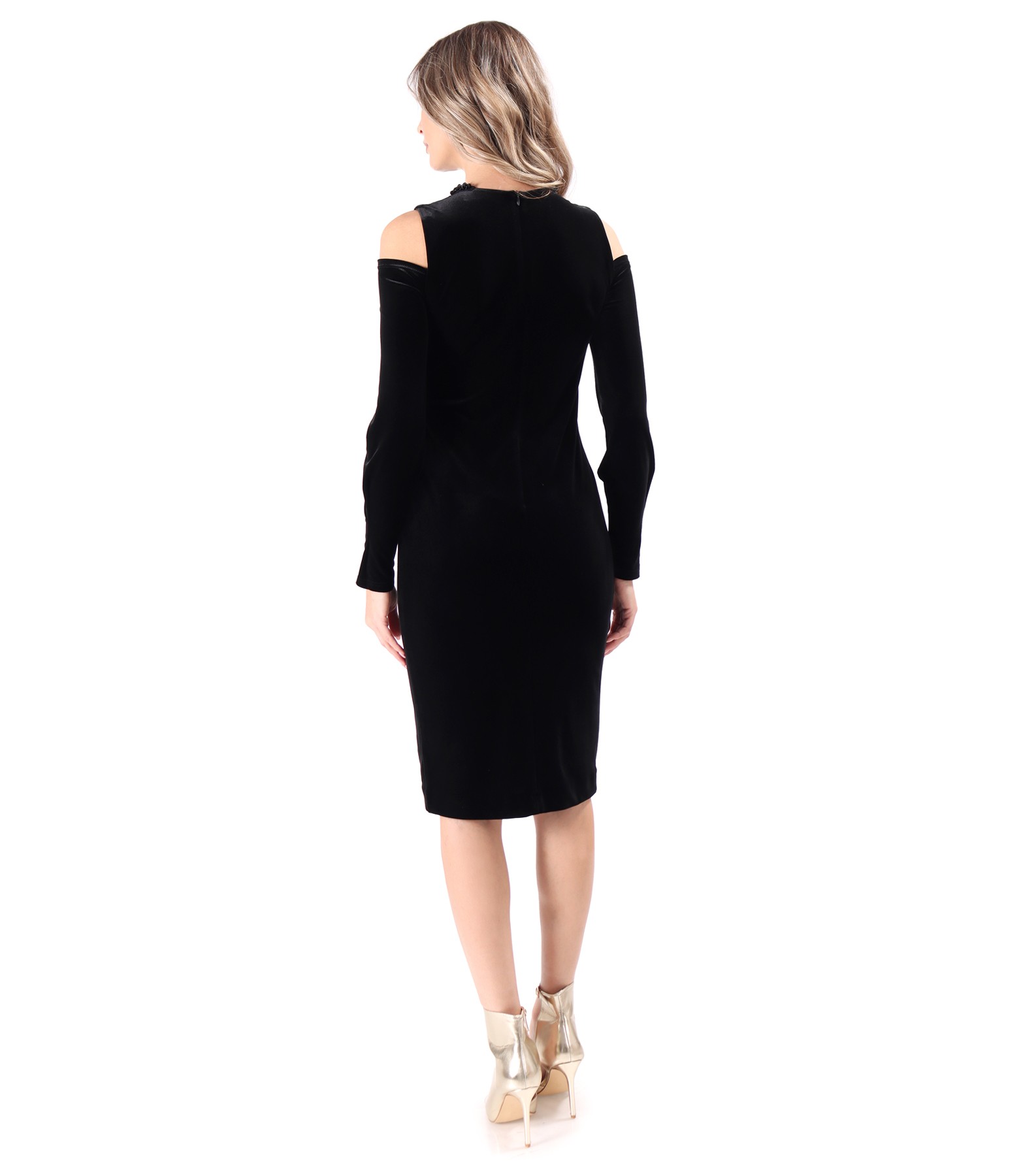 Evening dress made of black elastic velvet with bare shoulders, lined, slightly puffy long sleeves, and pointed collar with black stones. Closes with a hidden zipper in the middle of the back.