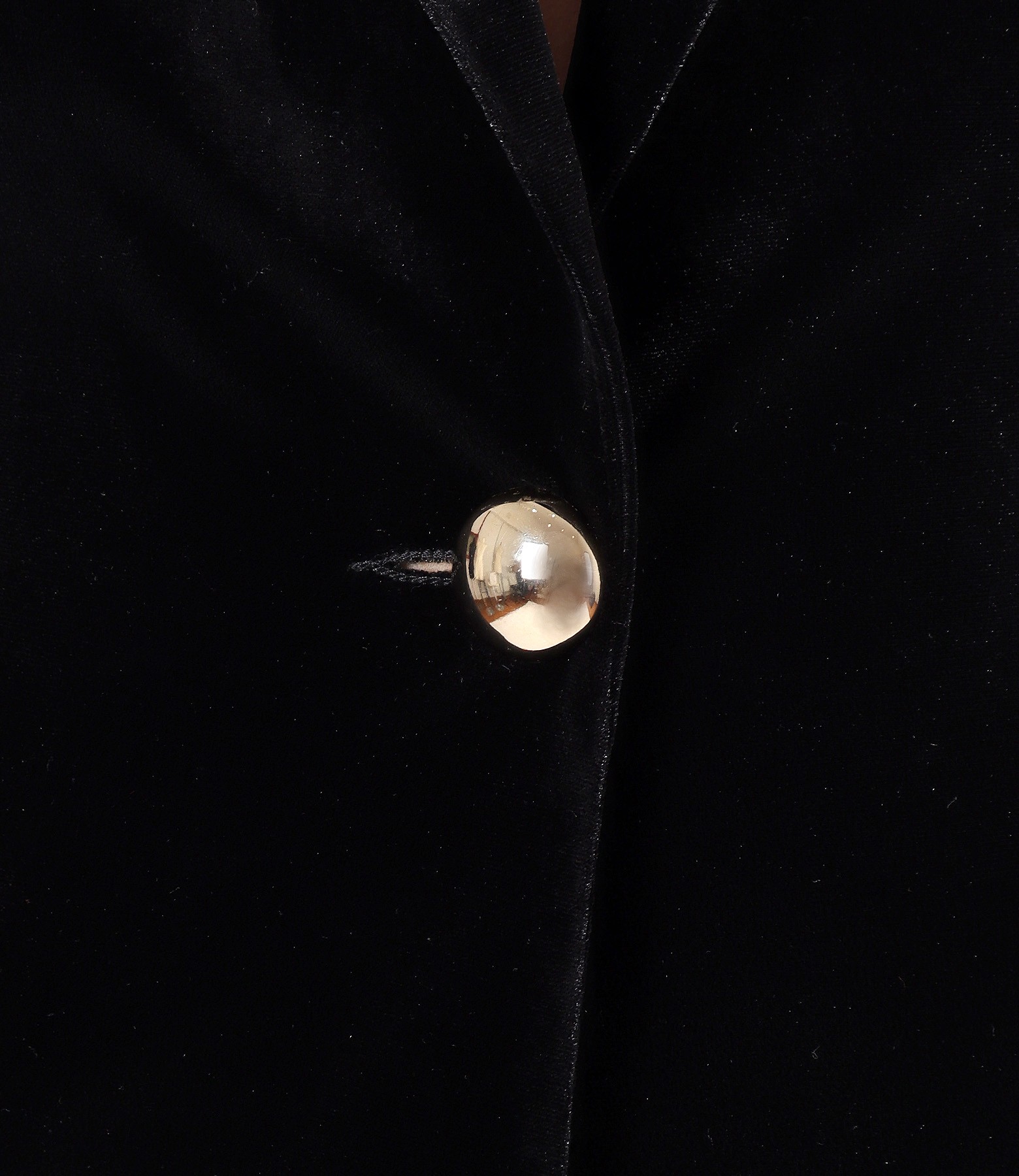 Jacket made of black elastic velvet, with a deep V-neckline and two decorative flaps on the front. Pointed collar and lapels. Closes with a button in the middle of the front.