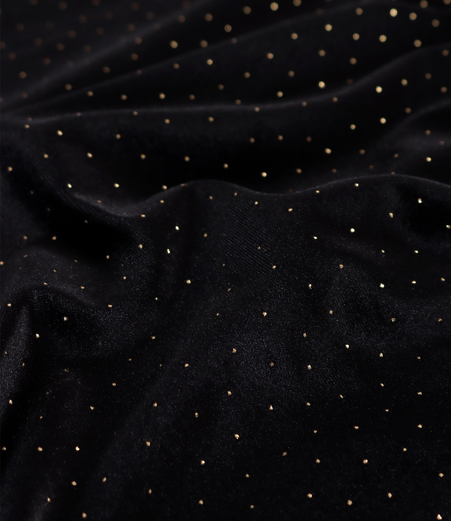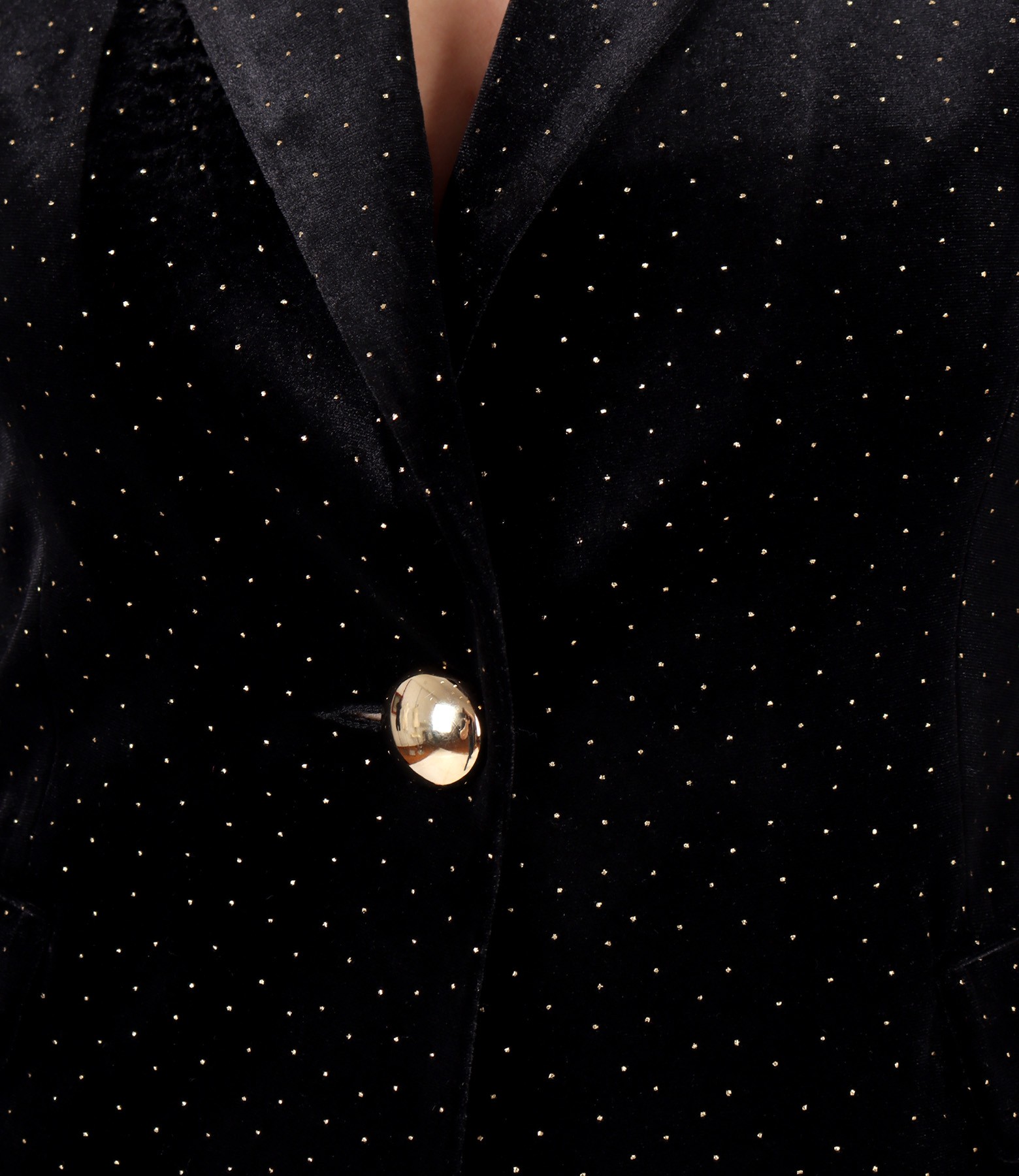 Jacket made of black elastic velvet, with a deep V-neckline and pockets with flaps on the front. Pointed collar and lapels. Closes with a button in the middle of the front.