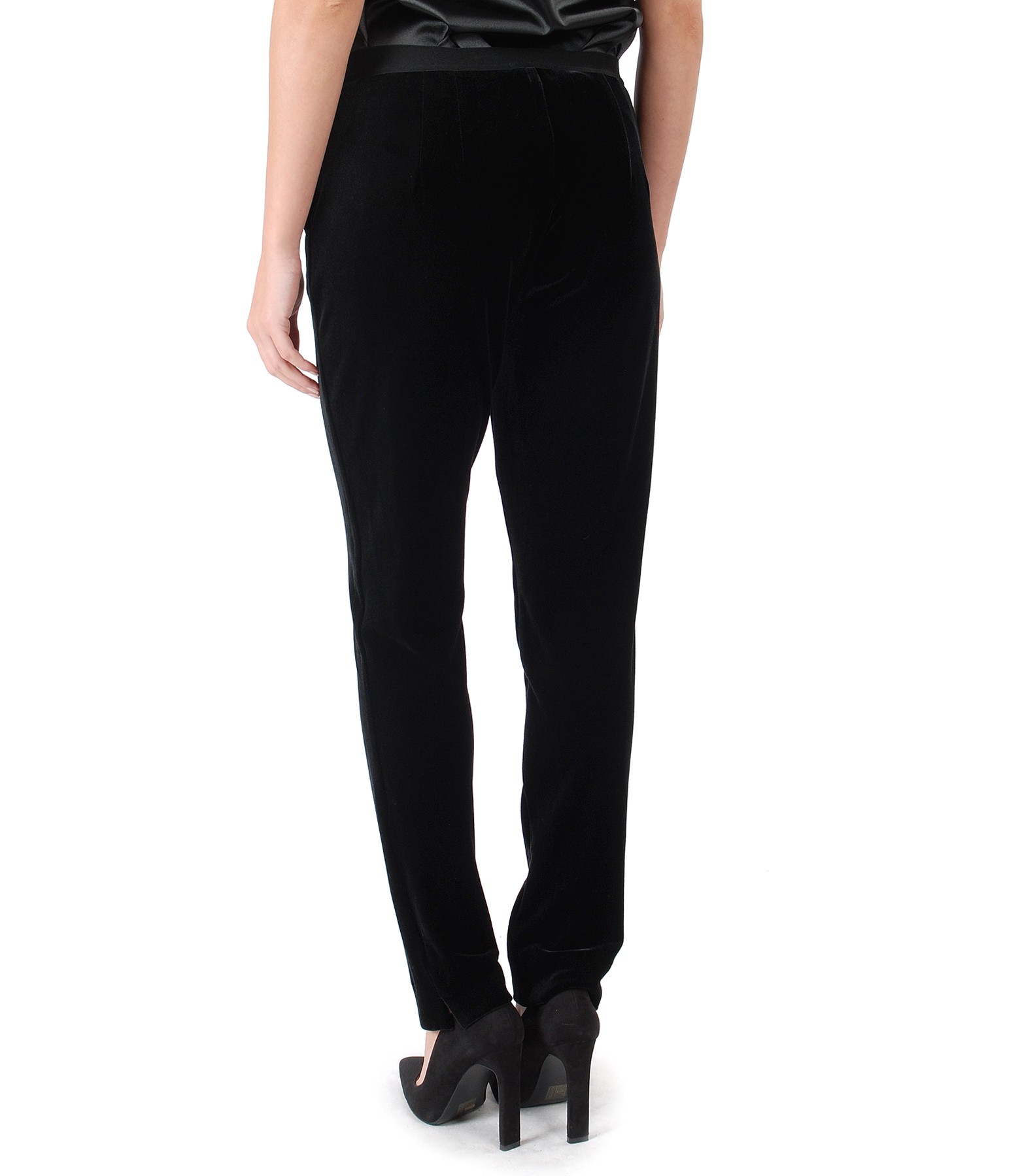 Black elastic velvet pants, ankle pants, with a front waist belt and elastic back; with side oblique pockets. Closes with normal zipper, button and 2 staples.