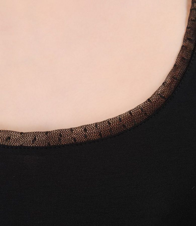 Black jersey t-shirt with round neck-cut. Long sleeves and garnish neck-cut, both from elastic tulle.