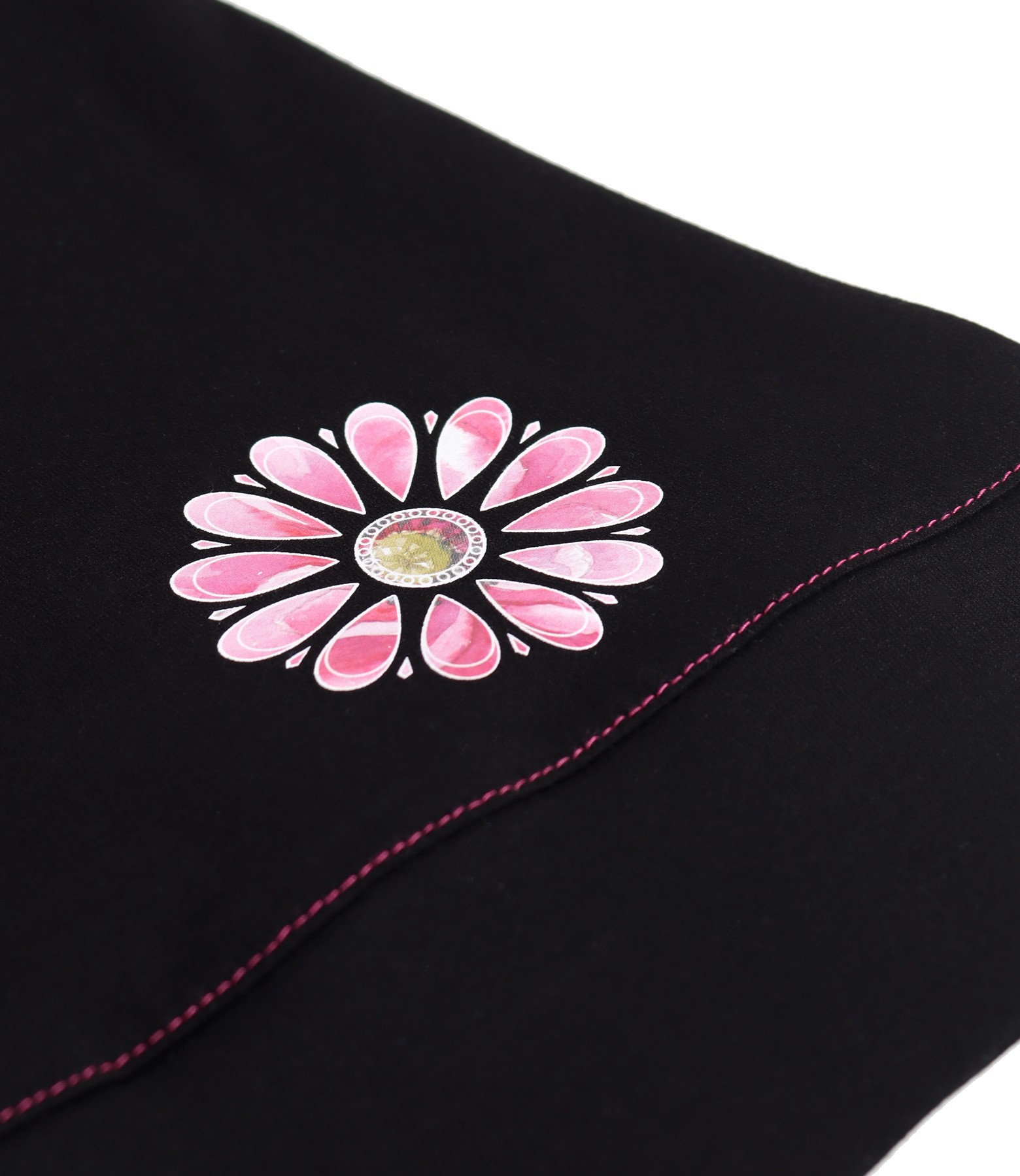 Blouse made of elastic jersey with dropped shoulders, a round neckline, and a decorative flower-shaped appliqué.