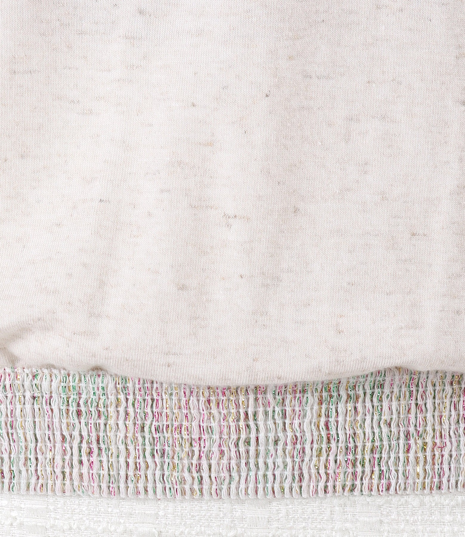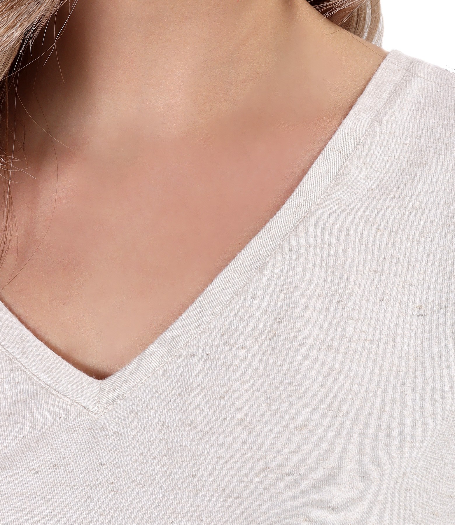 Blouse made of blend elastic jersey with viscose and flax,with short sleeves,V-neck and elastic with multicolored lurex thread at the end.