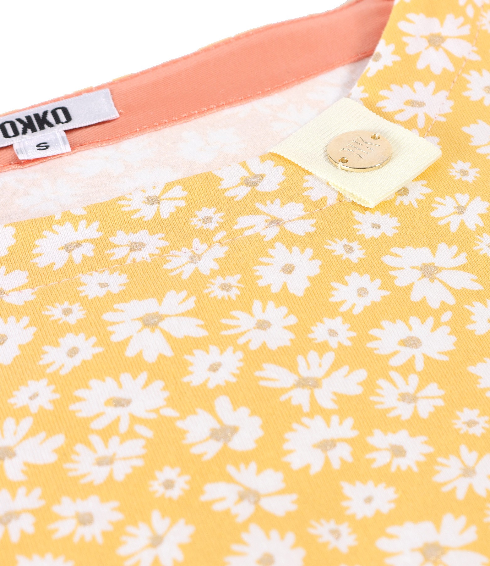 Blouse made of elastic cotton printed with floral motifs and golden details, short sleeves, and a round neckline.