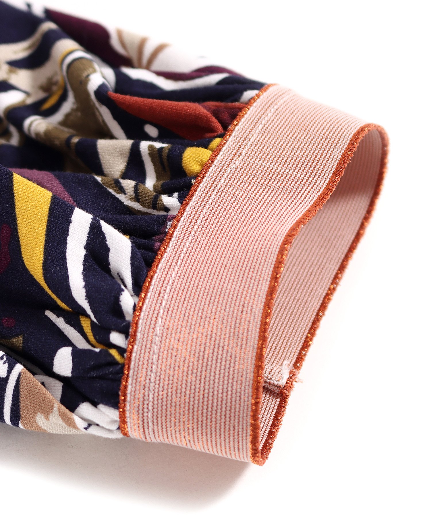 Blouse made of printed elastic jersey with floral motifs, featuring mid-length sleeves gathered at the ends, a decorative elastic band, and a round neckline.