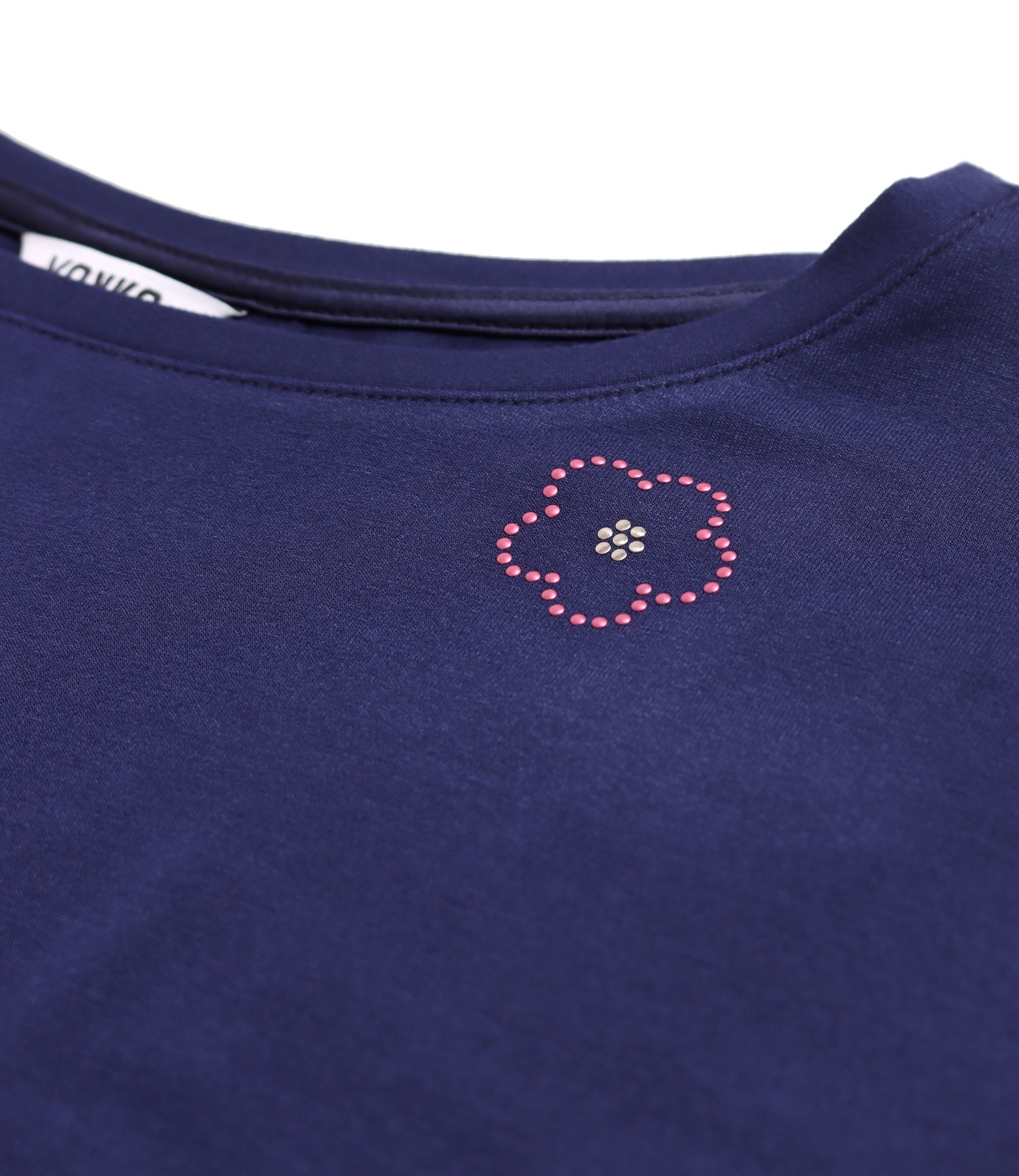 Blouse made of elastic jersey with dropped shoulders and a round neckline, featuring a decorative flower-shaped appliqué.
