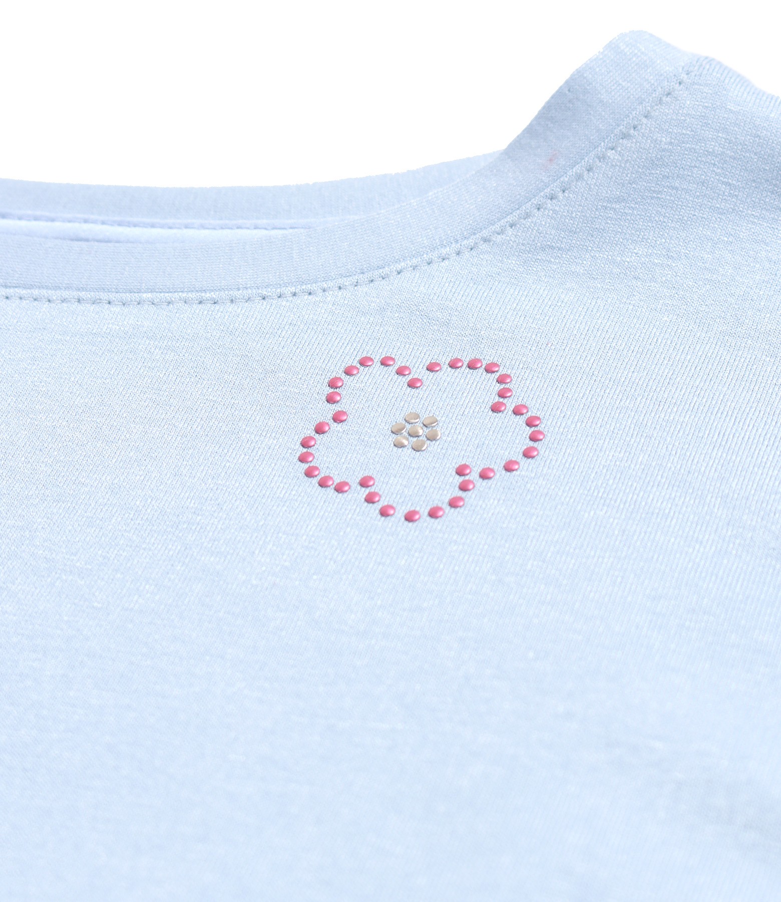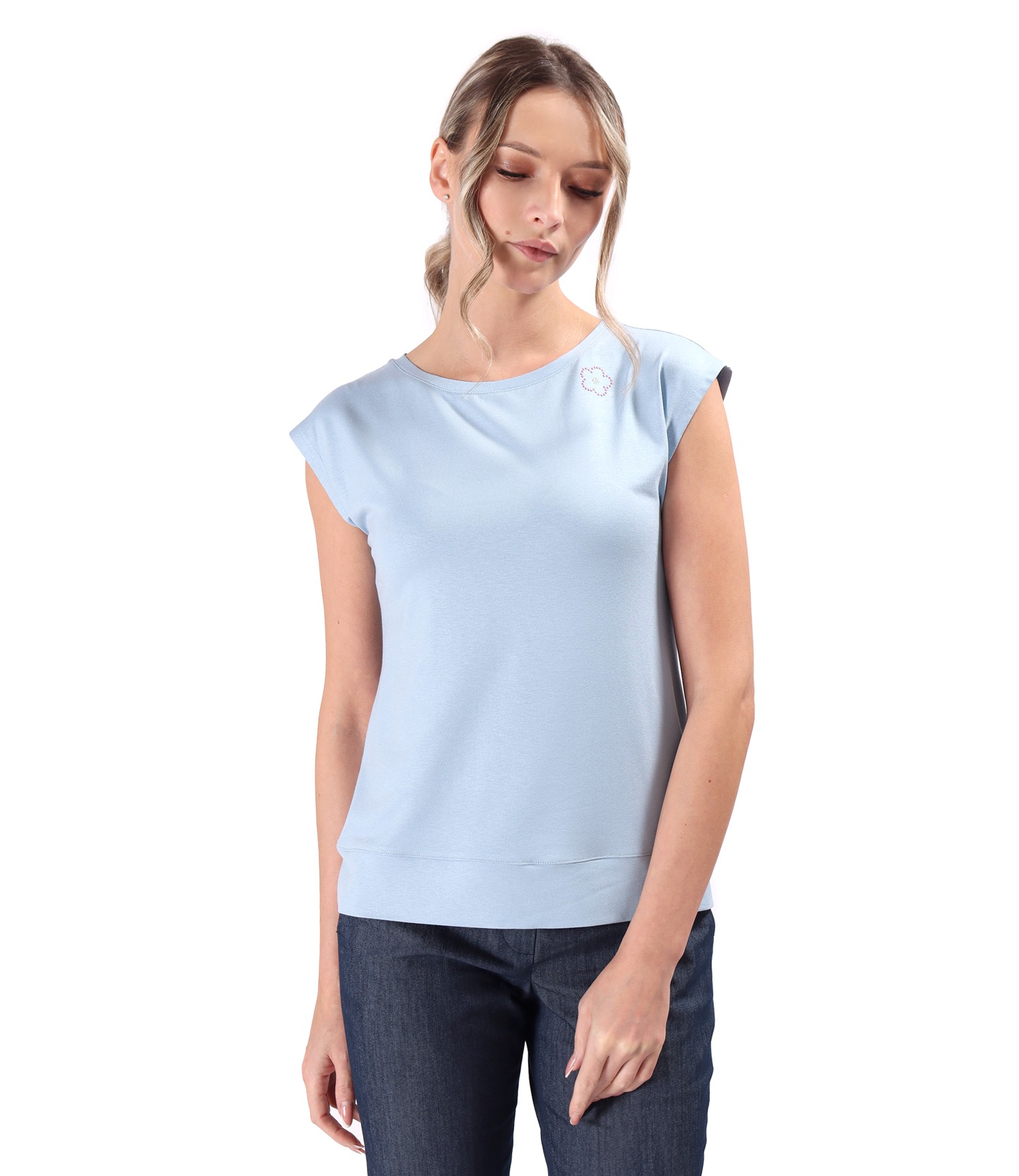 Blouse made of elastic jersey with dropped shoulders and a round neckline, featuring a decorative flower-shaped appliqué.