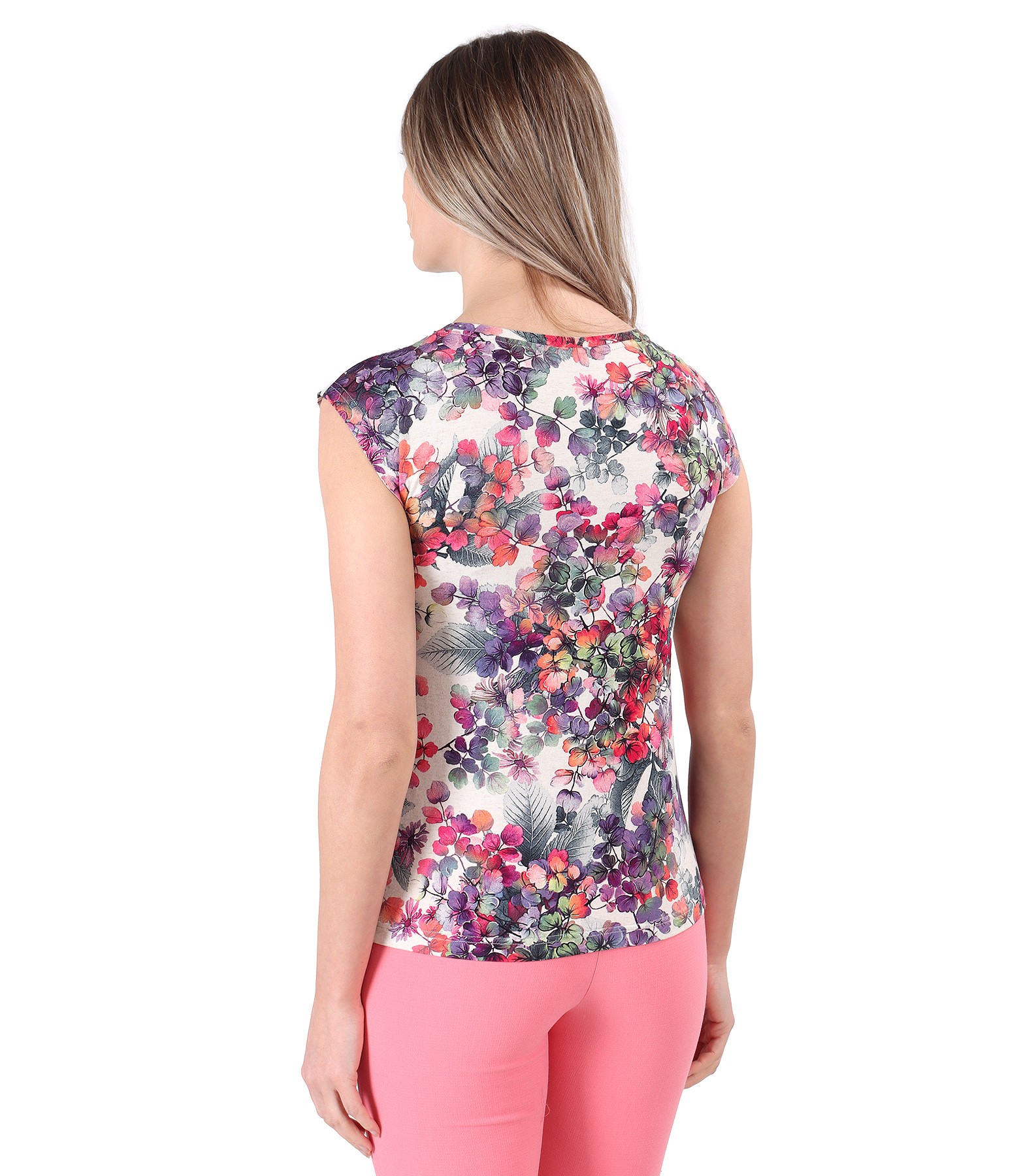 Blouse made of elastic viscose jersey and linen, printed with floral motifs, with a boat neckline and dropped shoulders.