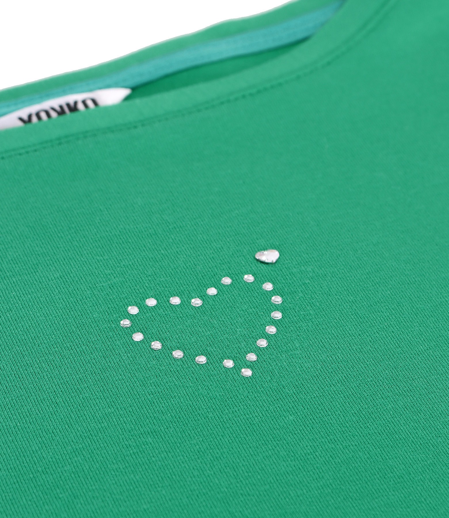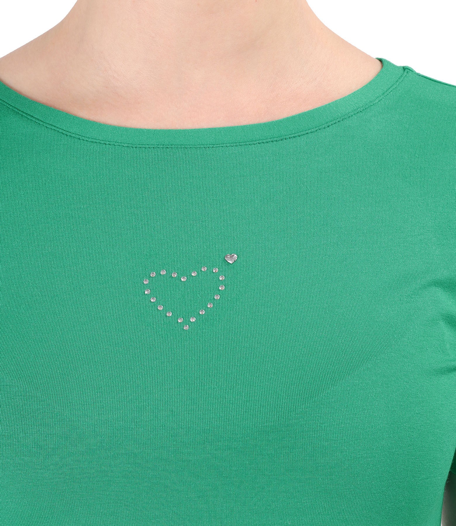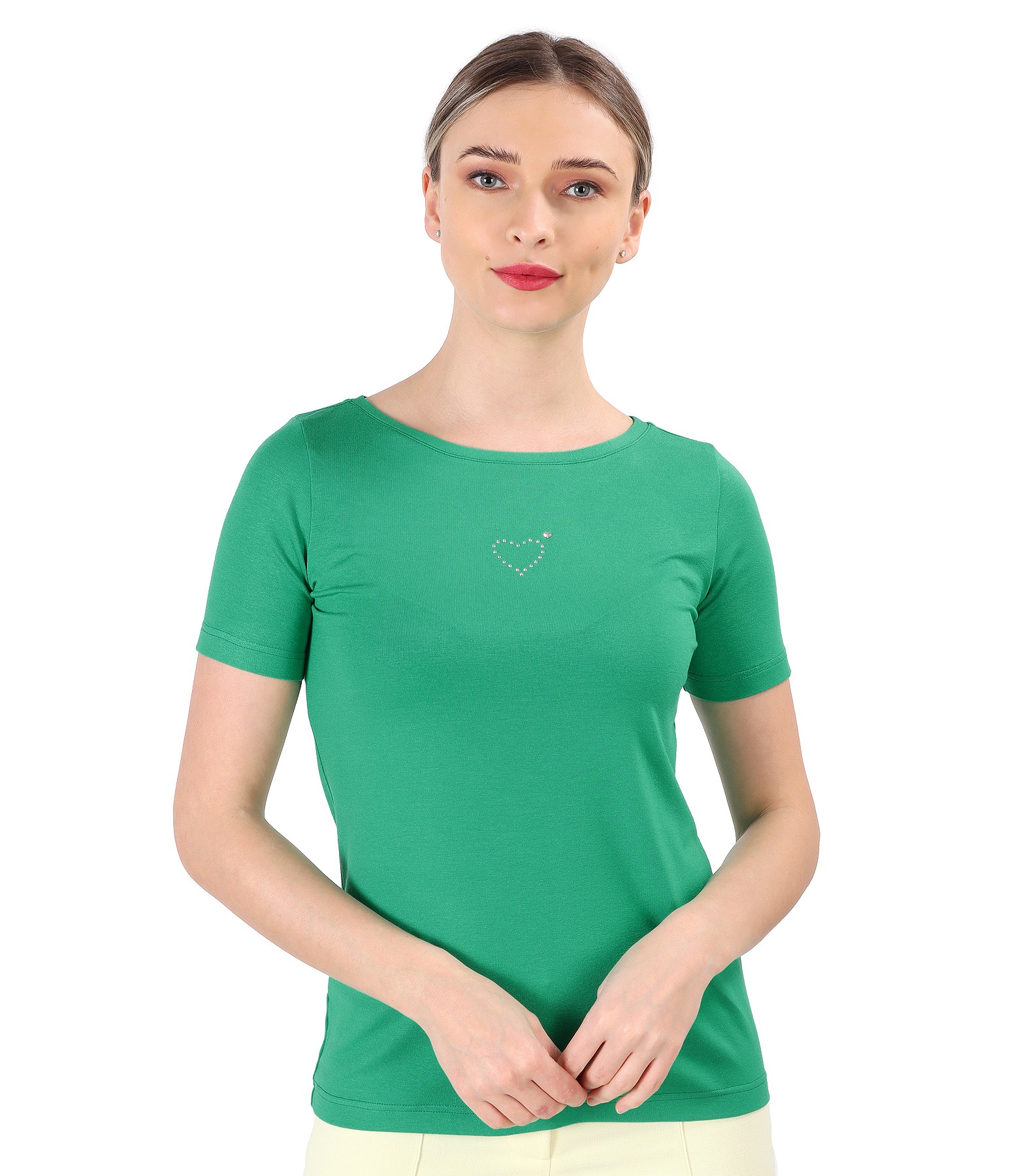 Blouse made of fine elastic jersey, with round neckline, short sleeves and heart-shaped decorative application on the face.