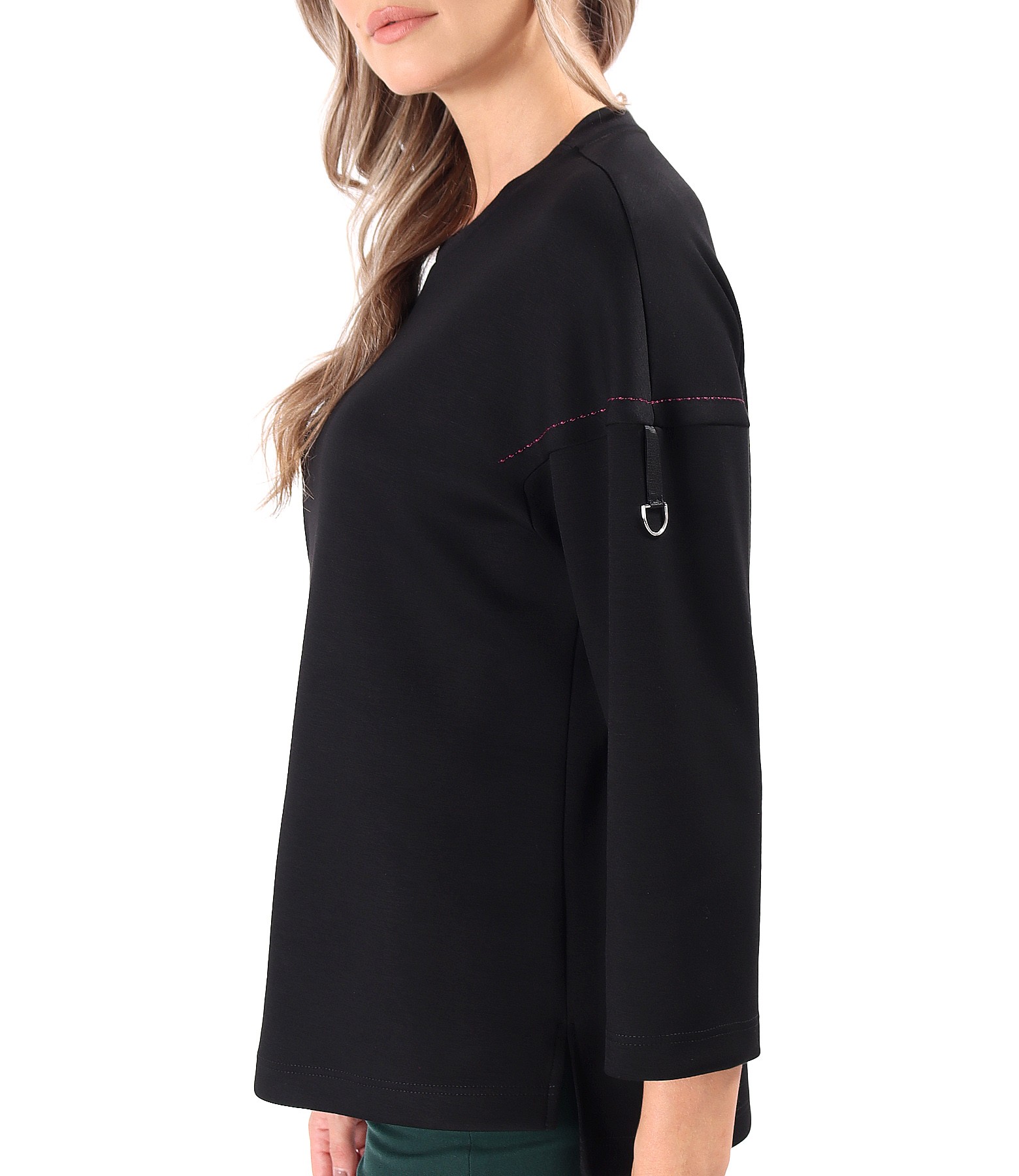 Blouse made of scuba with viscose, 3/4 dropped sleeves, decorative stitching on the sleeves, and rips with a buckle on the left sleeve.