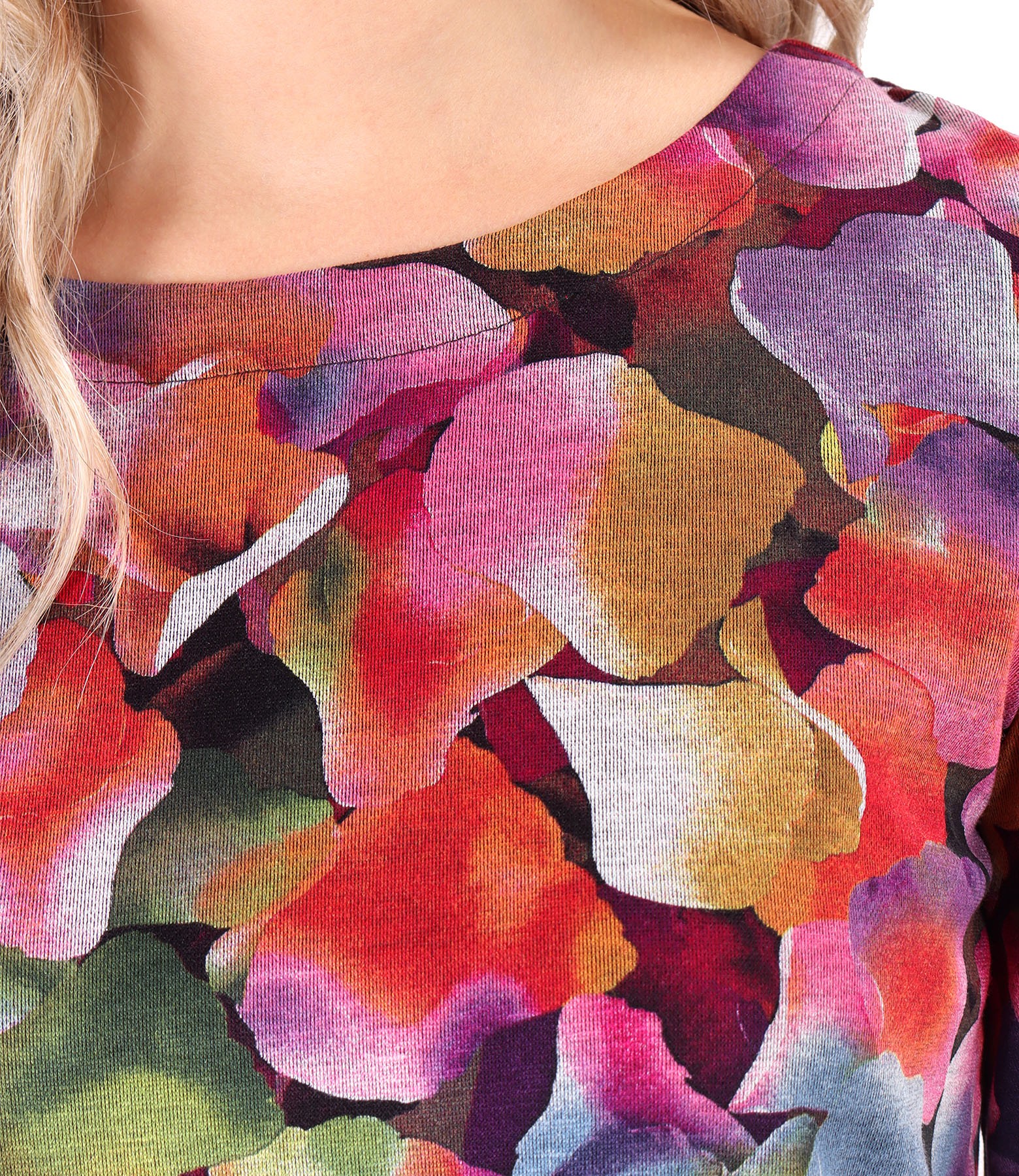 Blouse made of thick elastic jersey printed with floral motifs, with 3/4 sleeves and round decolletage.