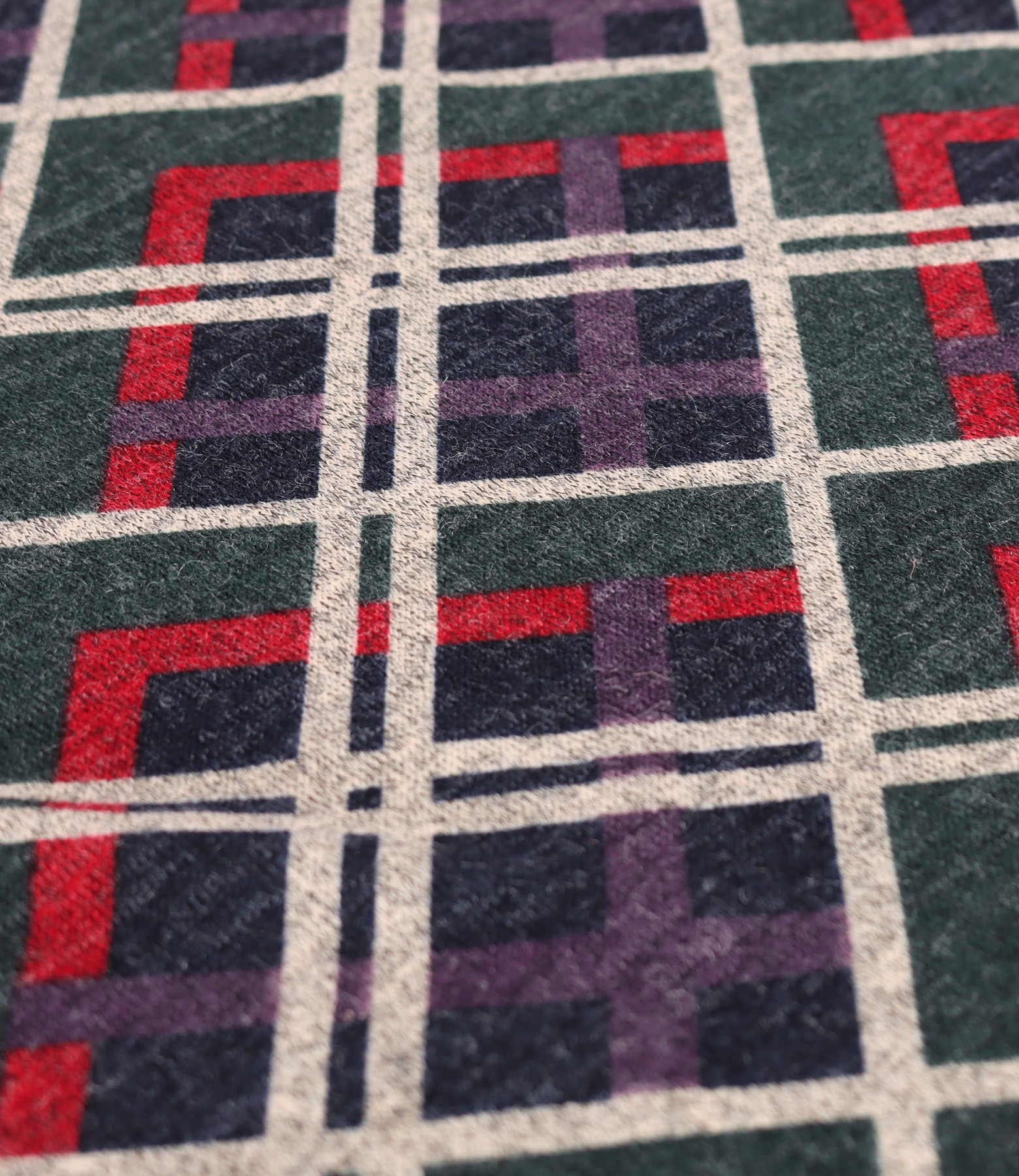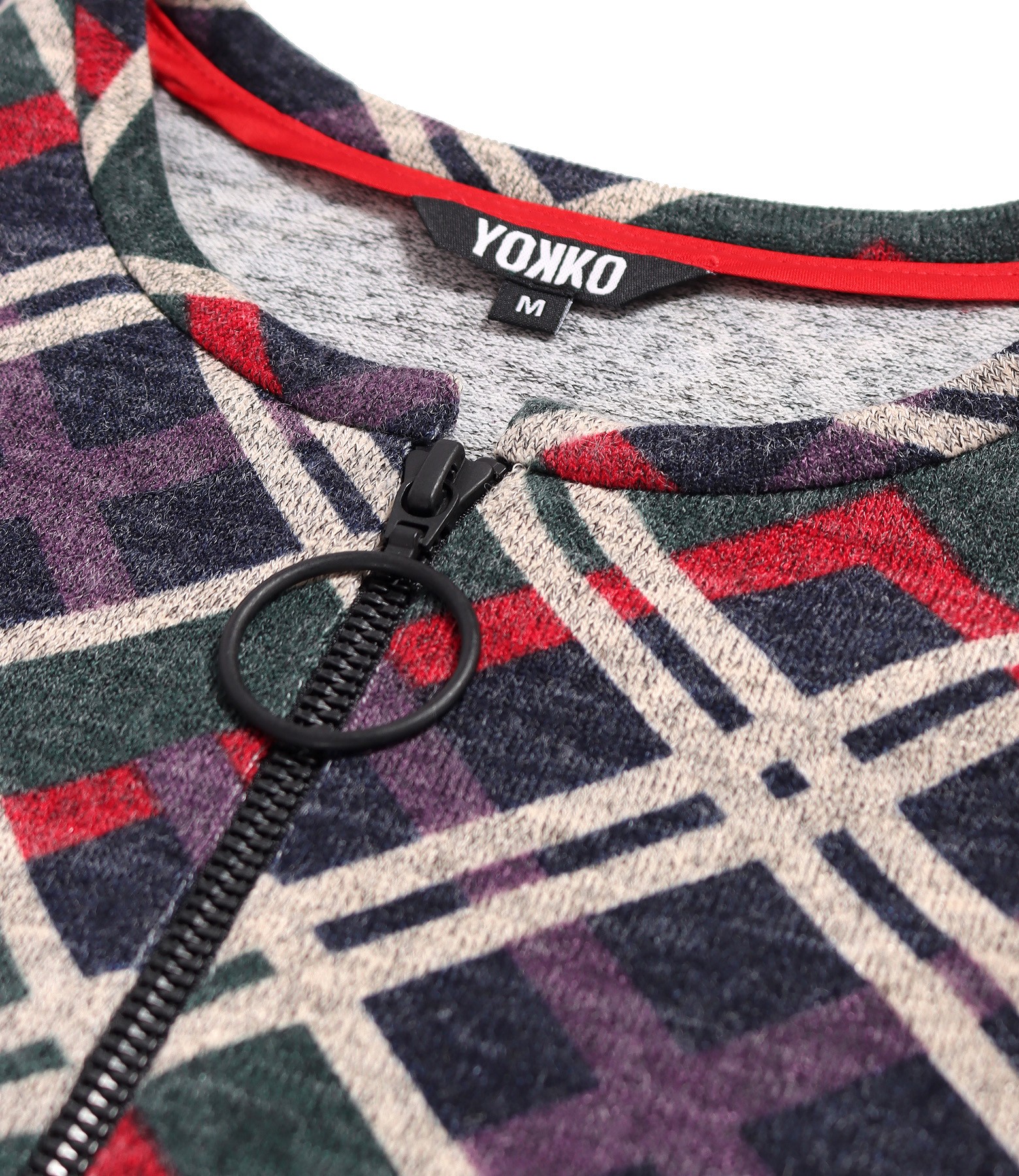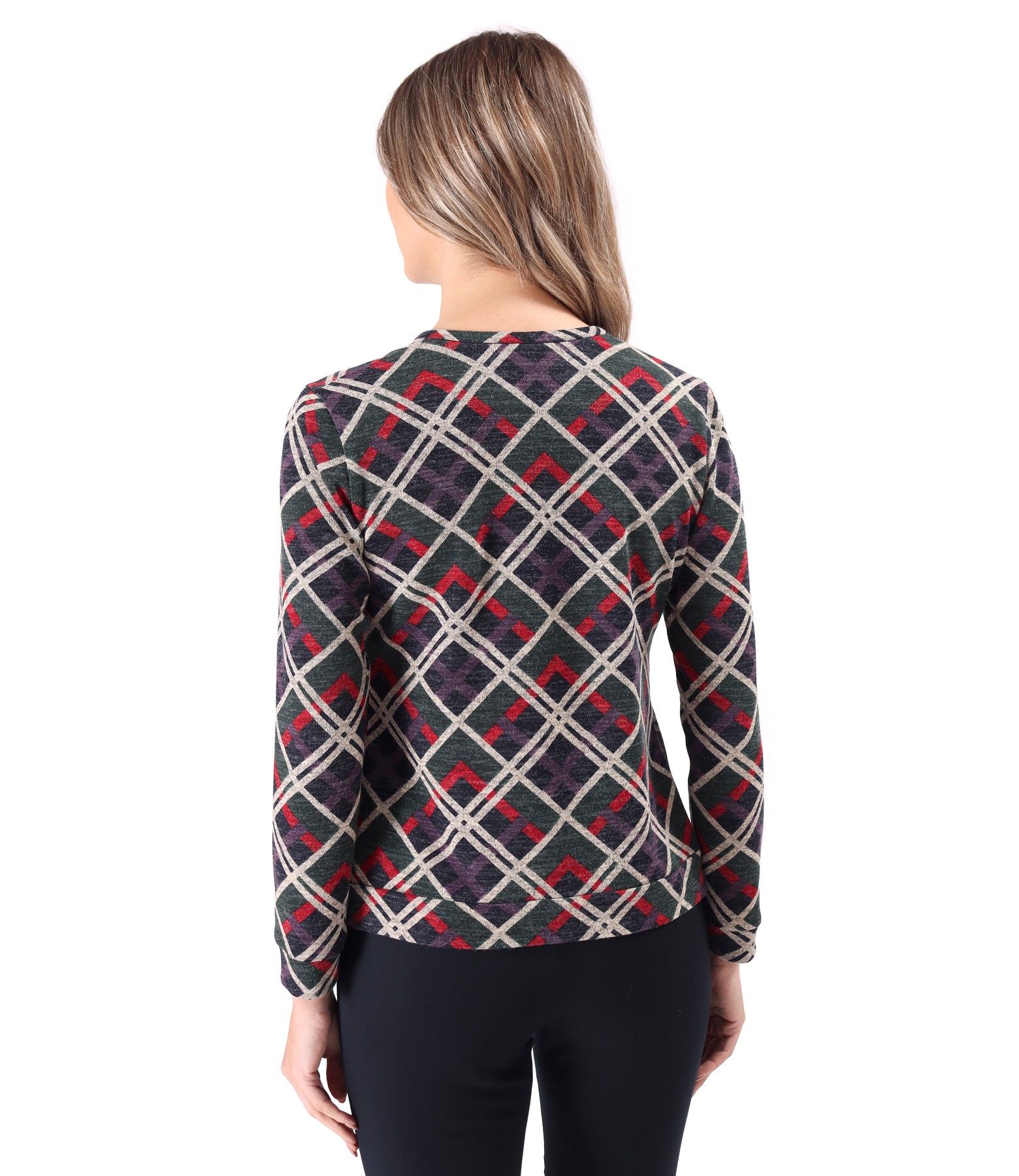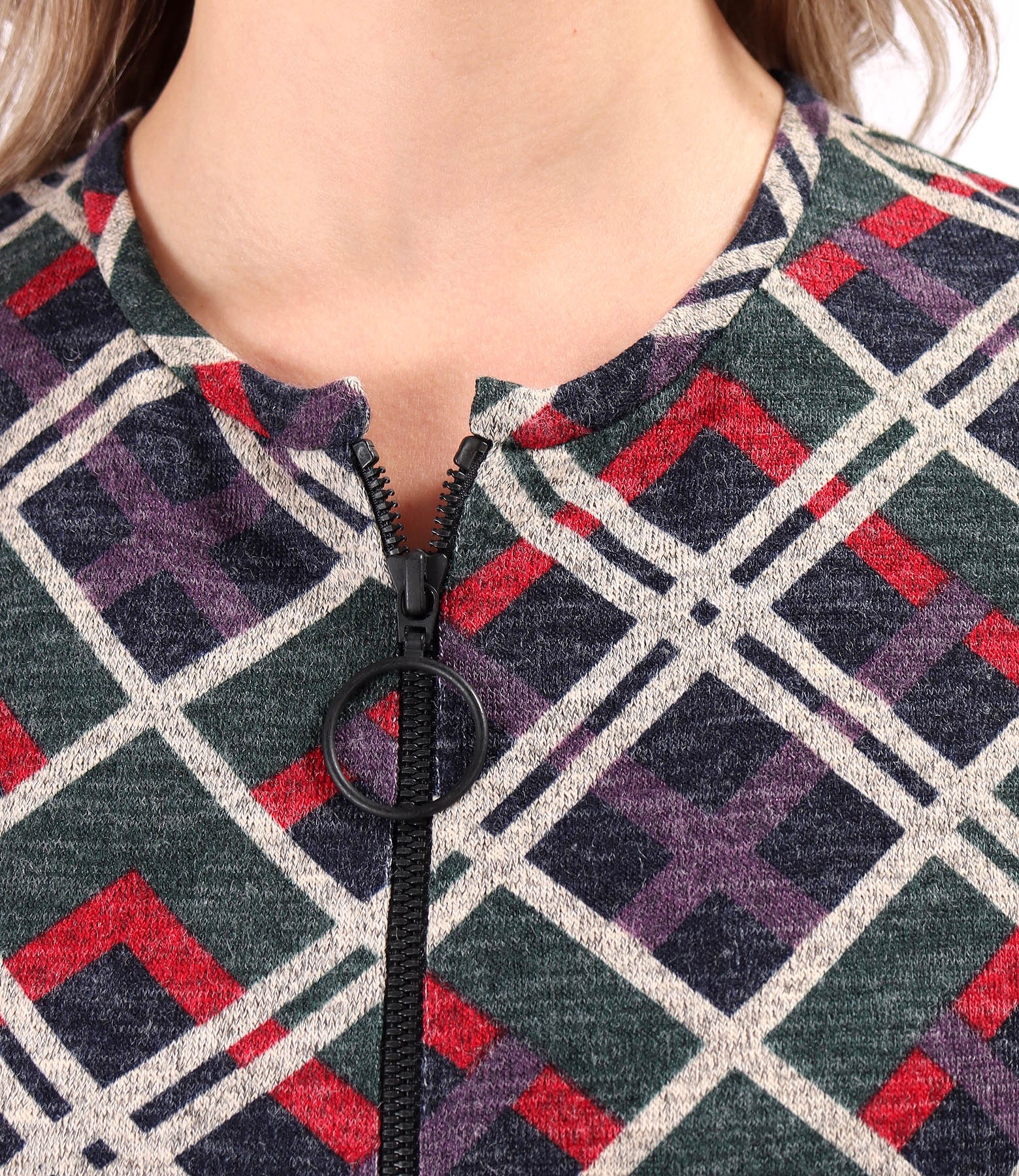 Blouse made of thick elastic jersey with front zipper, printed with geometric motifs, a round neckline, and long sleeves.