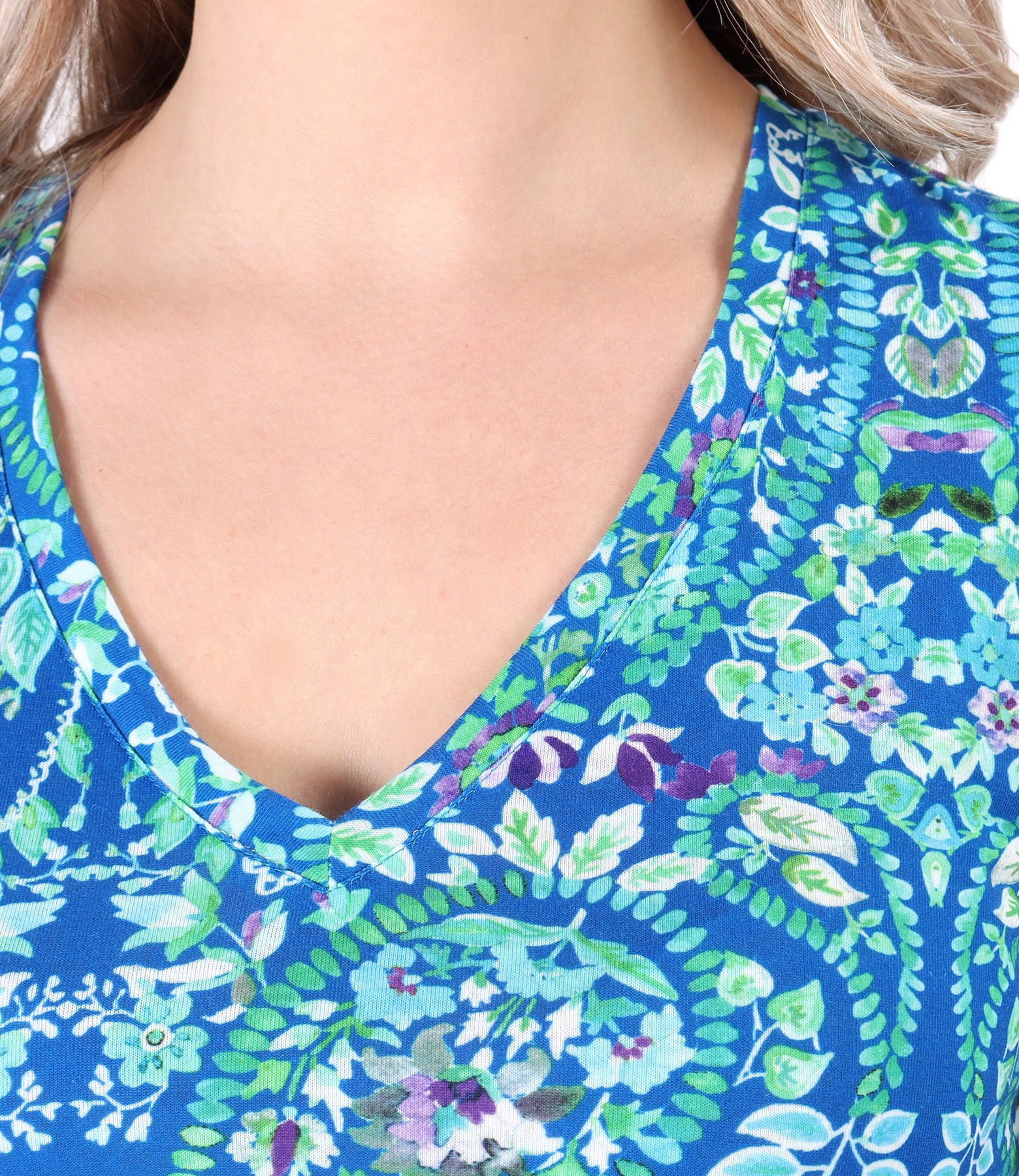 Blouse made of thin elastic jersey printed with floral motifs, short sleeves and V-neckline.