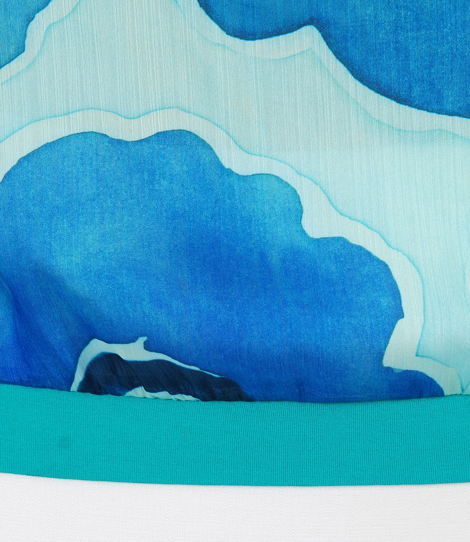 Elastic jersey blouse, with front veil with floral print, round low-cut neck and draping sleeves.