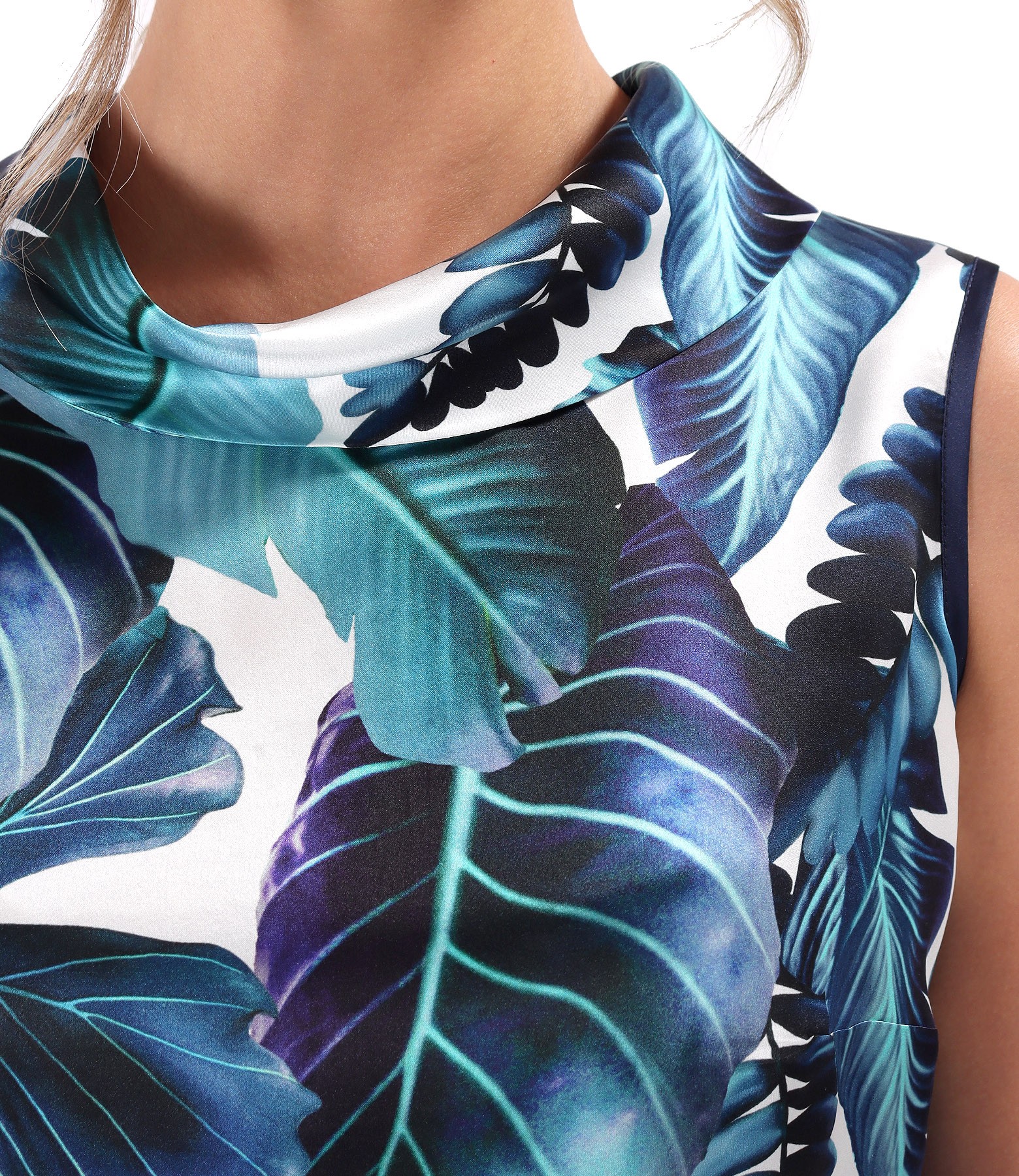 Blouse with front made of natural silk digitally printed with floral motifs, sleeveless, round collar at the base of the neck, and elastic jersey back. It closes with 3 buttons on the middle back.