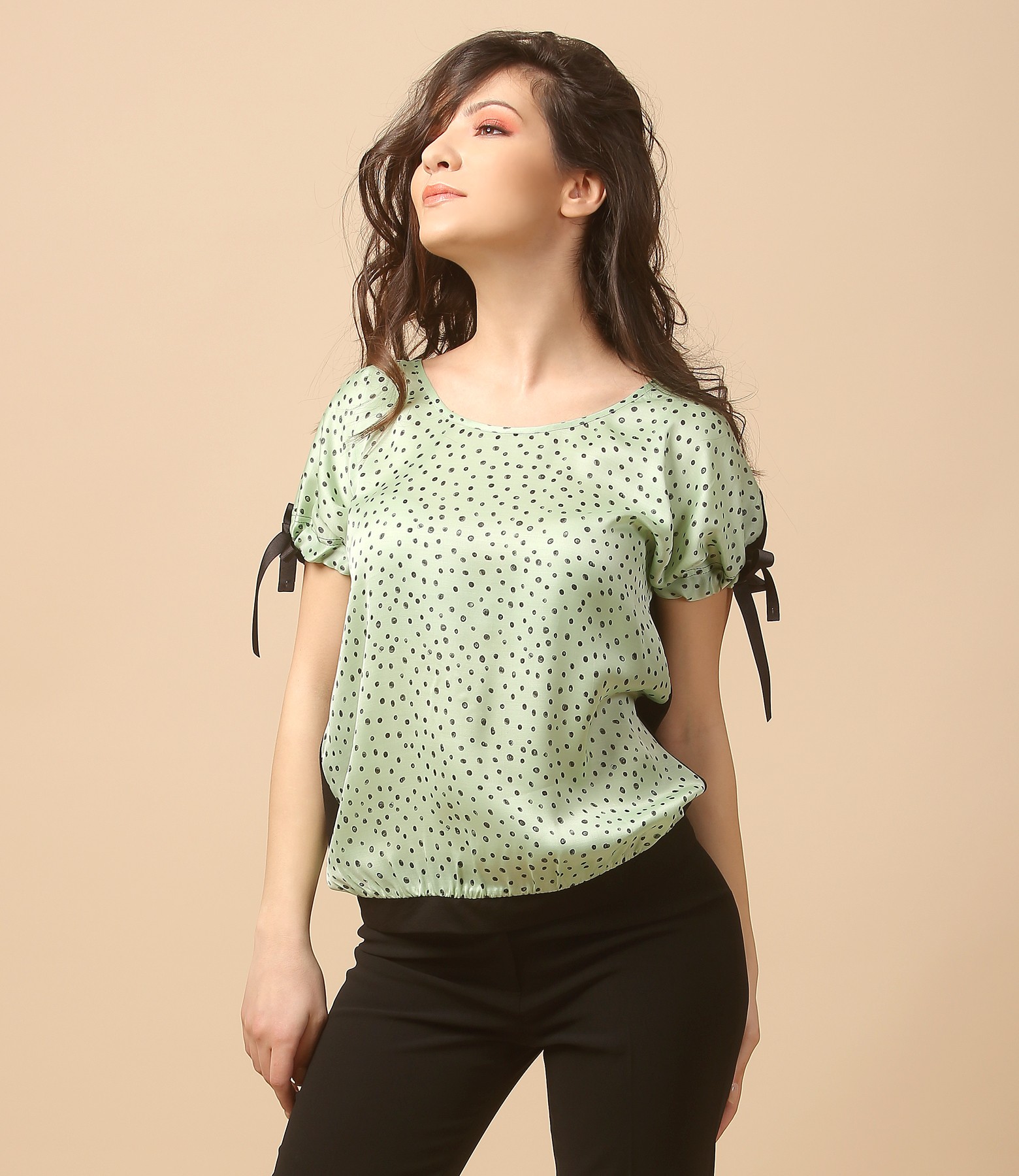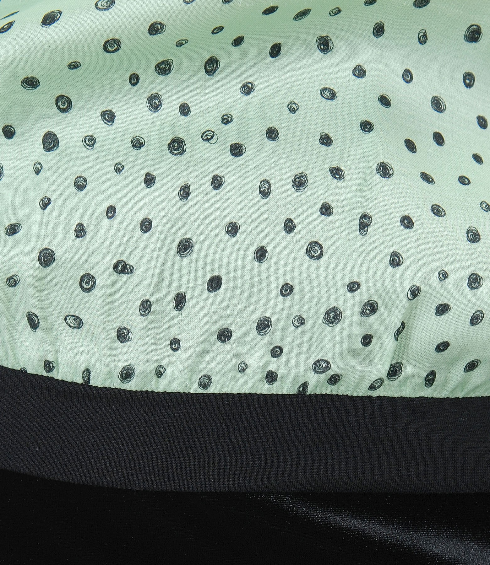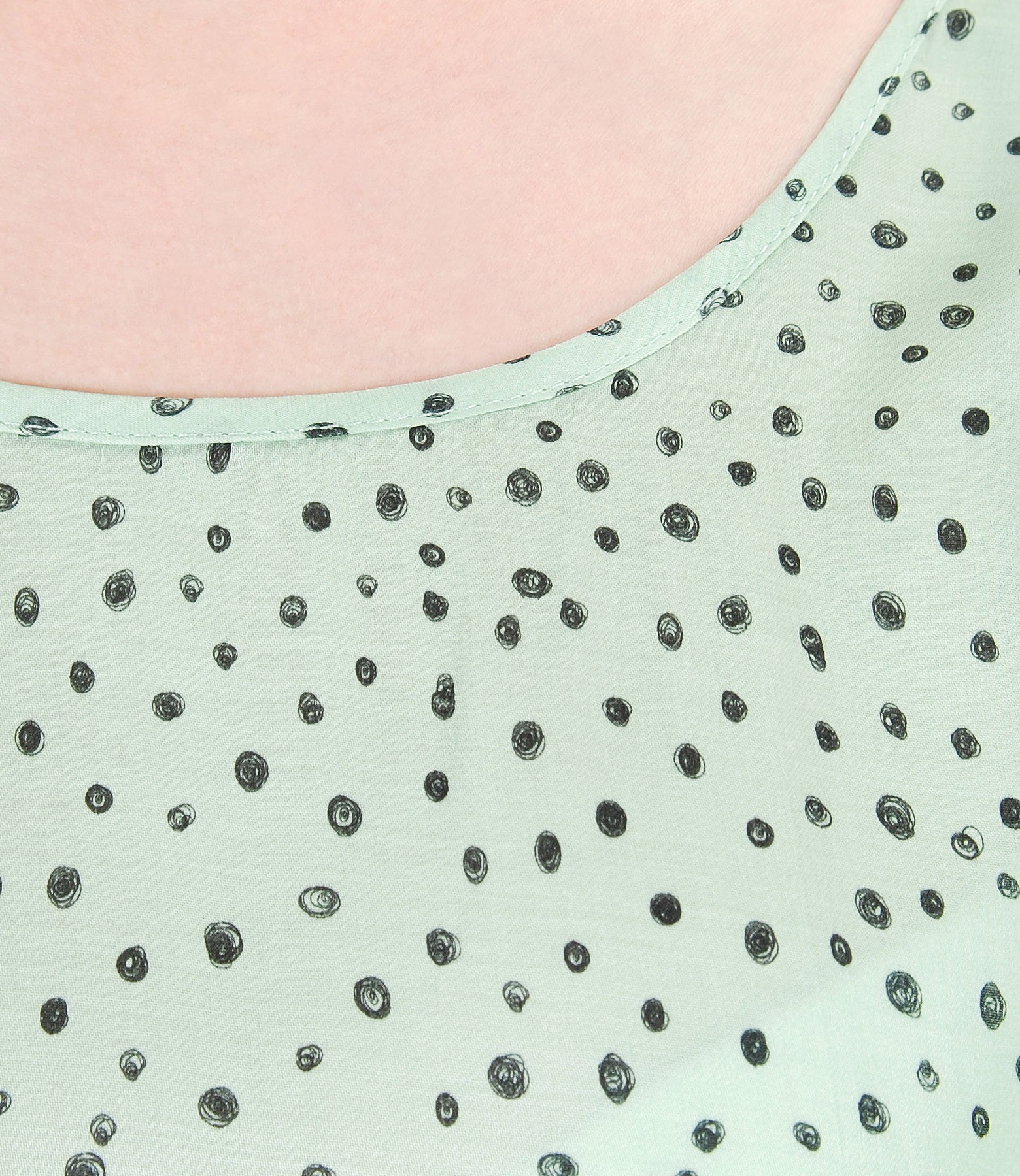 Blouse with front made of geometric printed viscose, digital printed, the back made of uni viscose, round low-cut neck and trimmed edge. Have no closing system.