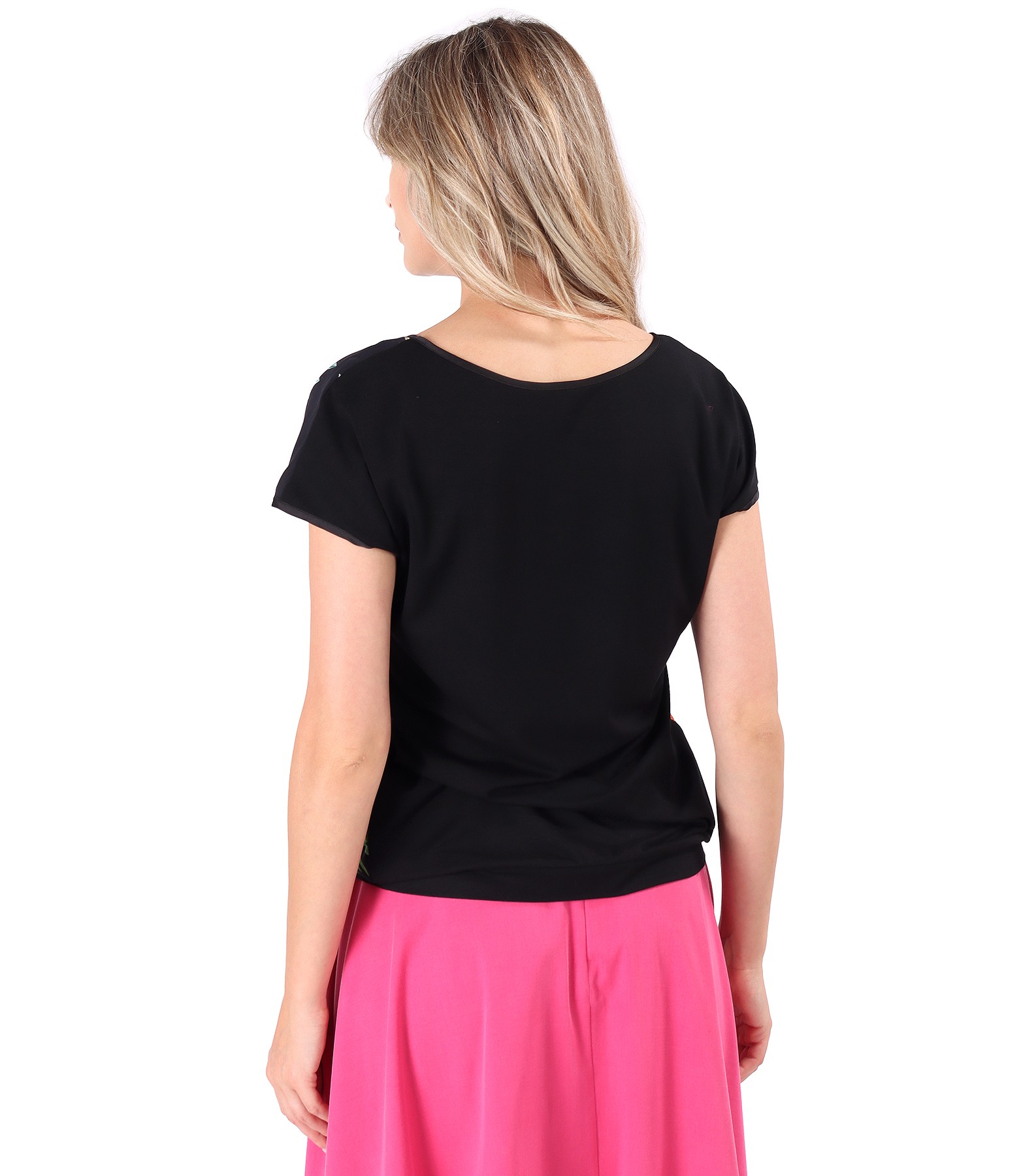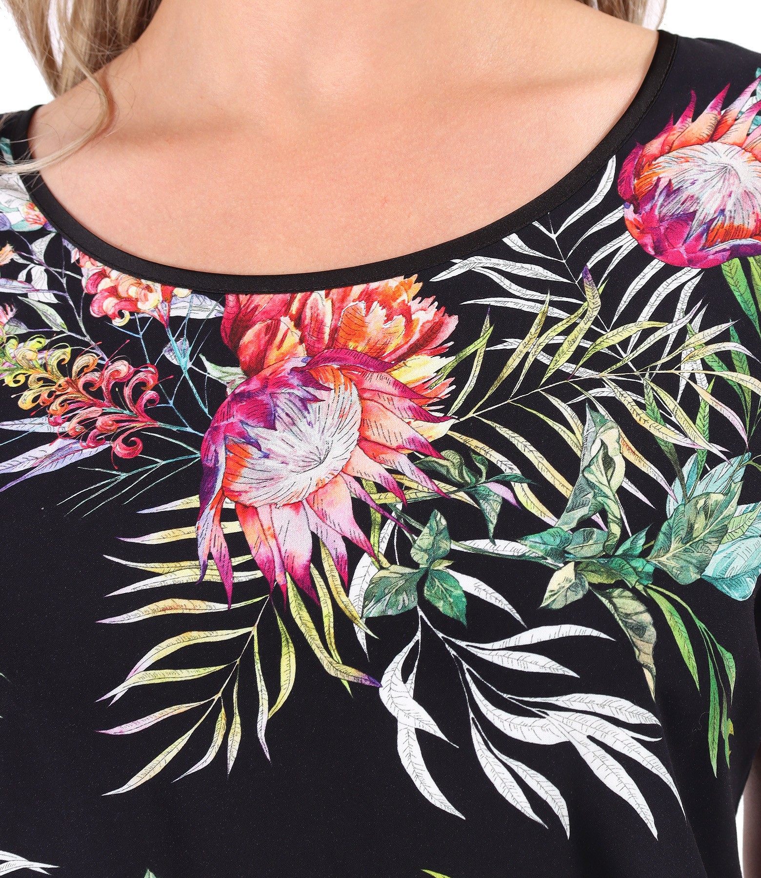 Elastic jersey blouse, with digitally printed viscose face with floral motifs, with round neckline and dropped sleeves.