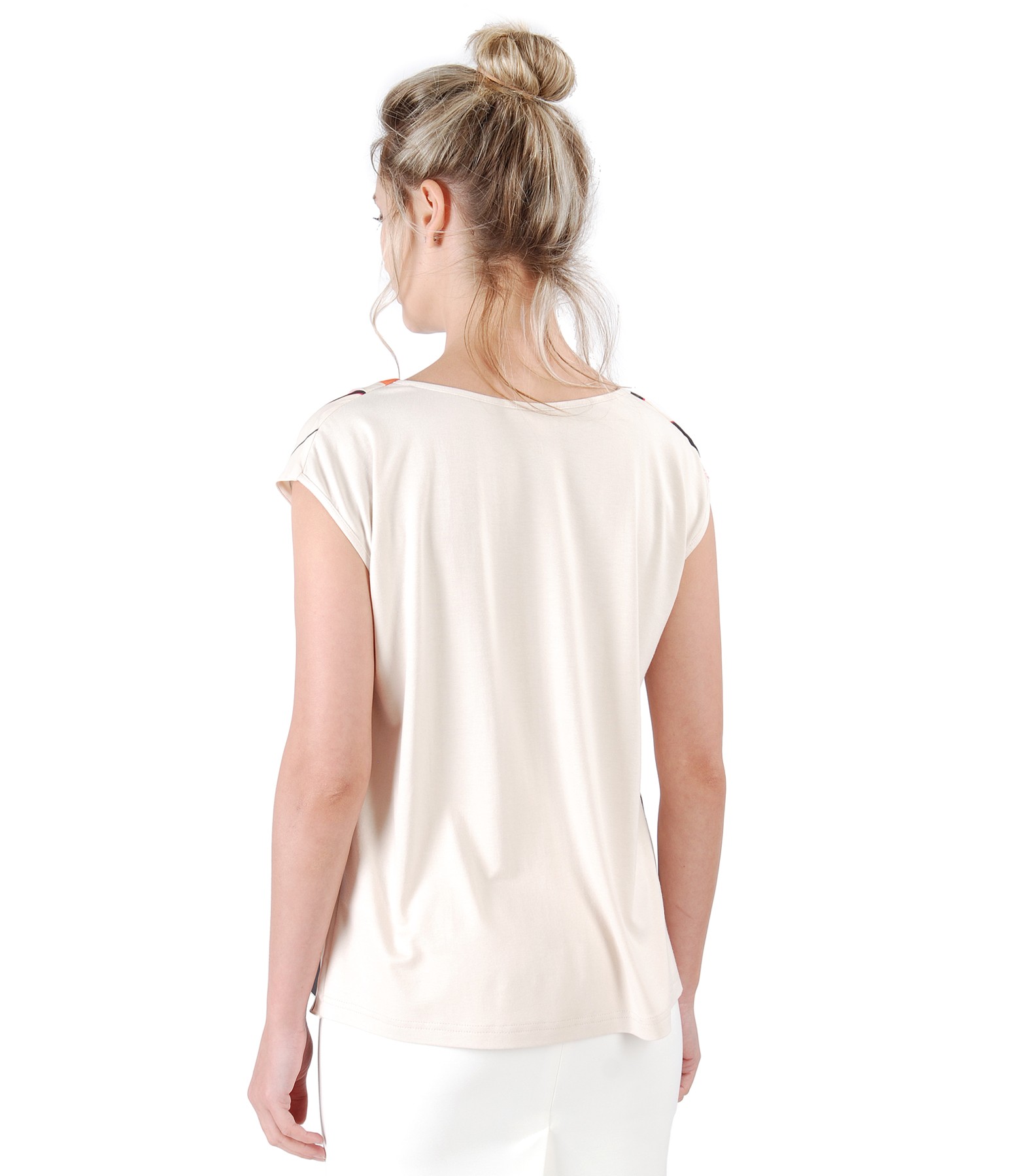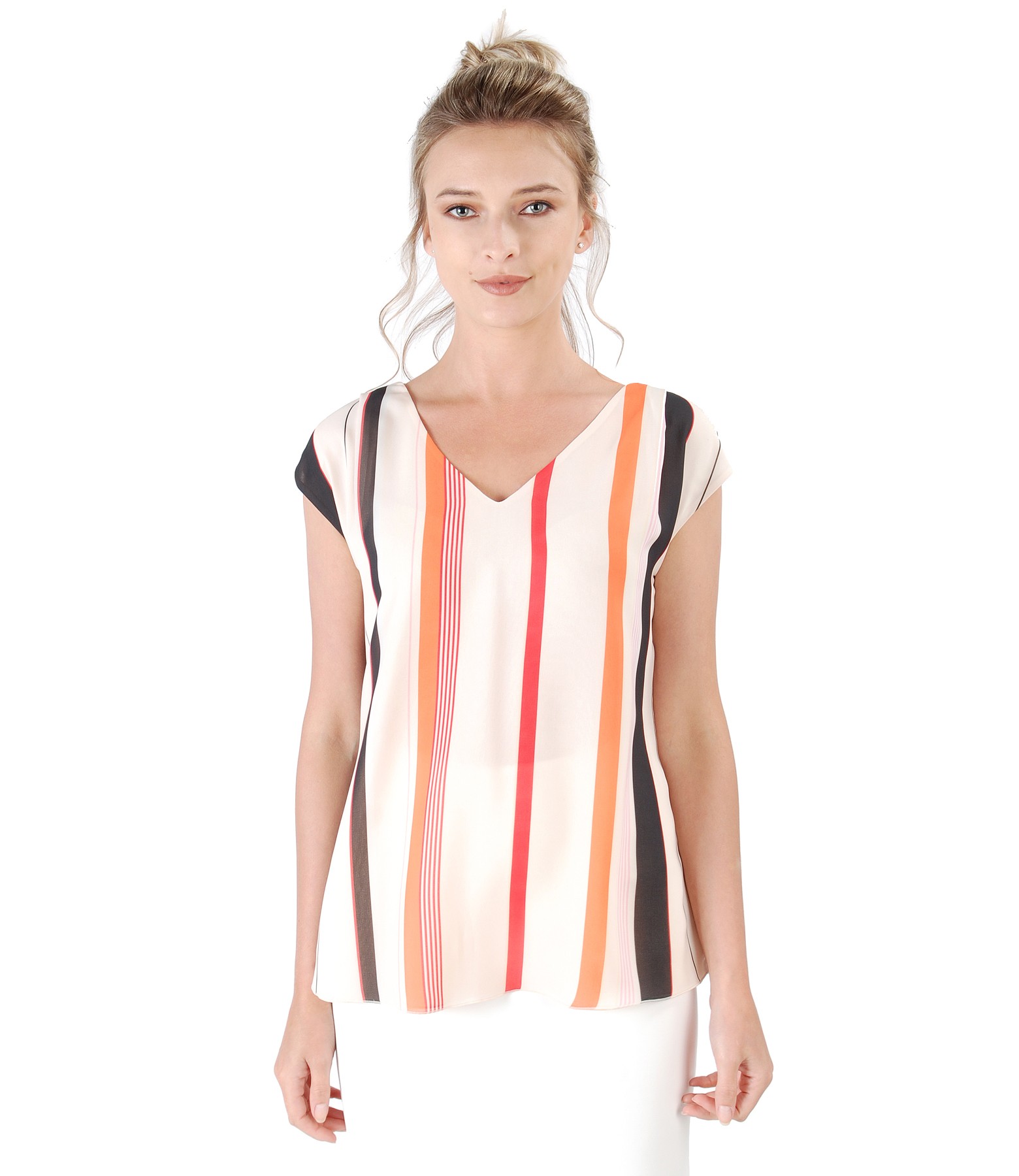 Casual blouse, with digital stripes print, with the nack made of uni elastic jersey, draping shoulders and V low-cut neck.