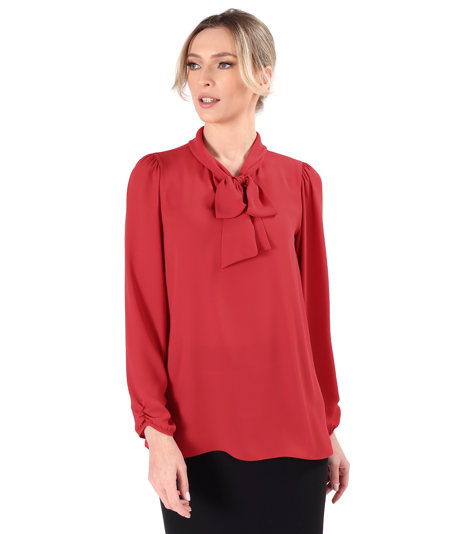 Blouse with long sleeves and scarf collar, embellished with crystals on the sleeve edge.