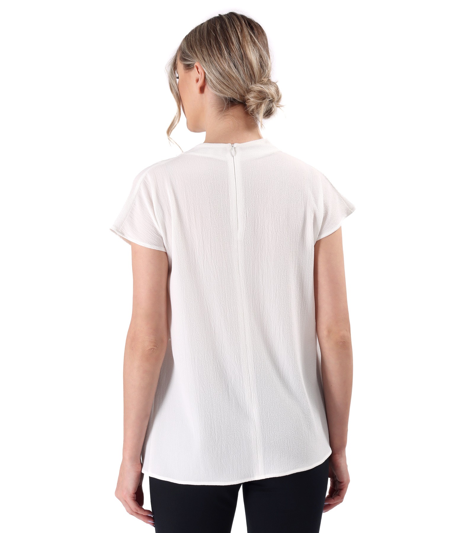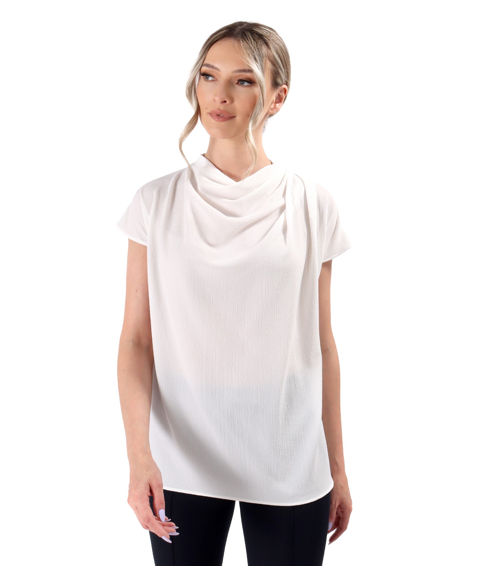 Blouse with pleats on the left shoulder and short sleeves. It closes with a zipper in the middle of the back.