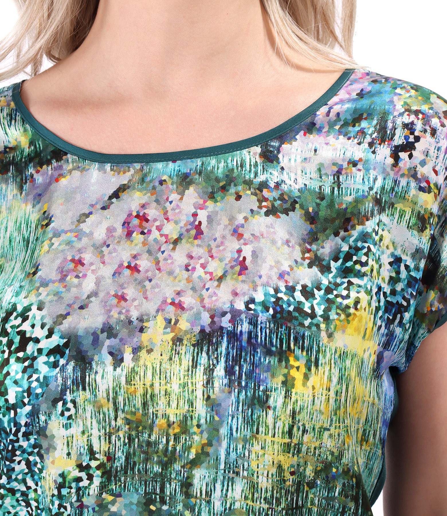 Blouse with printed natural silk front, round neckline, dropped sleeves, and elastic jersey back.