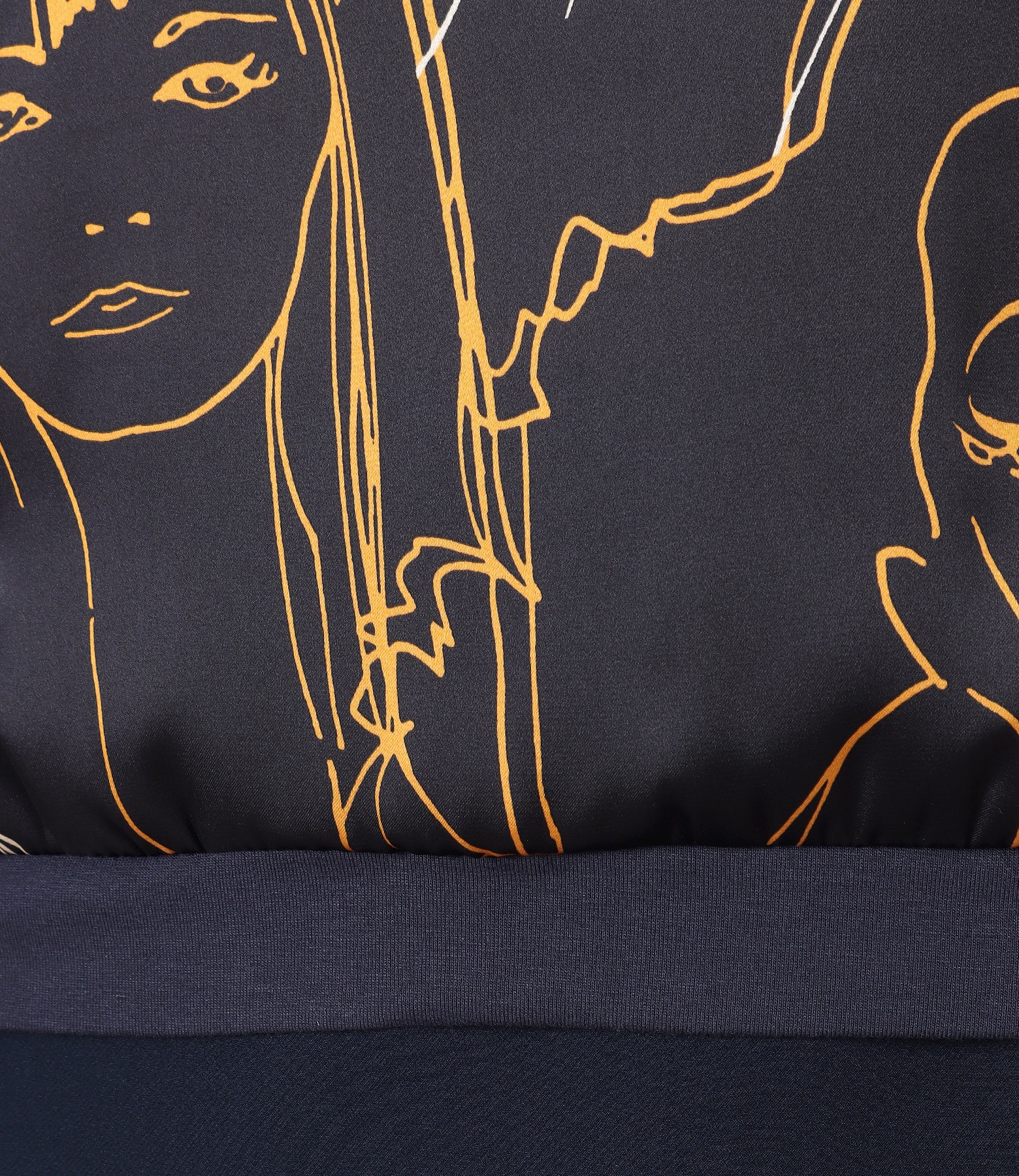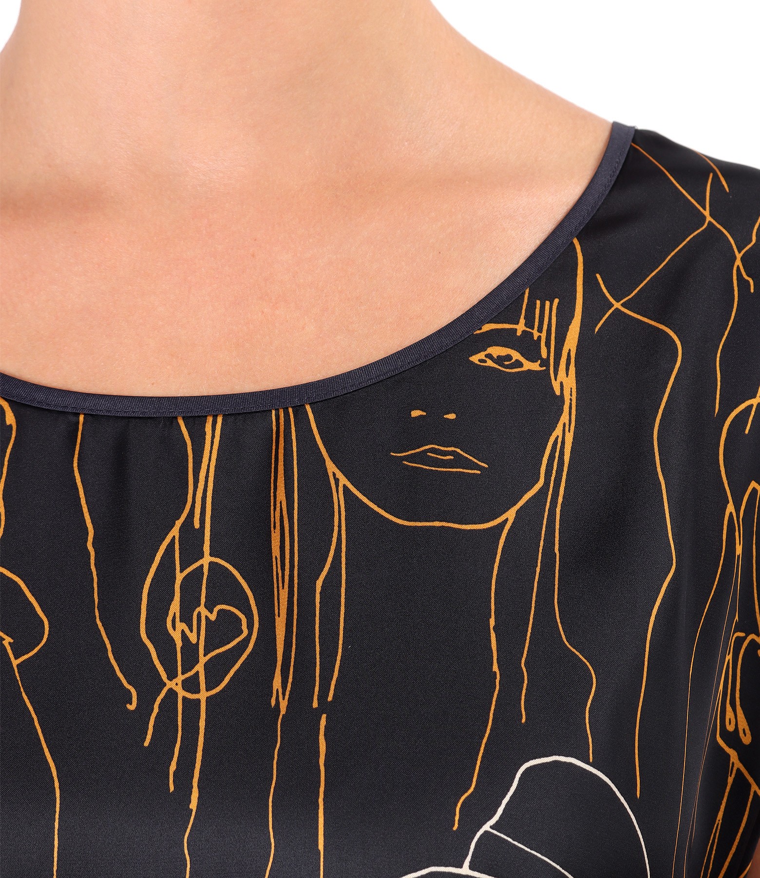 Elastic jersey blouse, with printed satin front and round neckline and dropped sleeves.