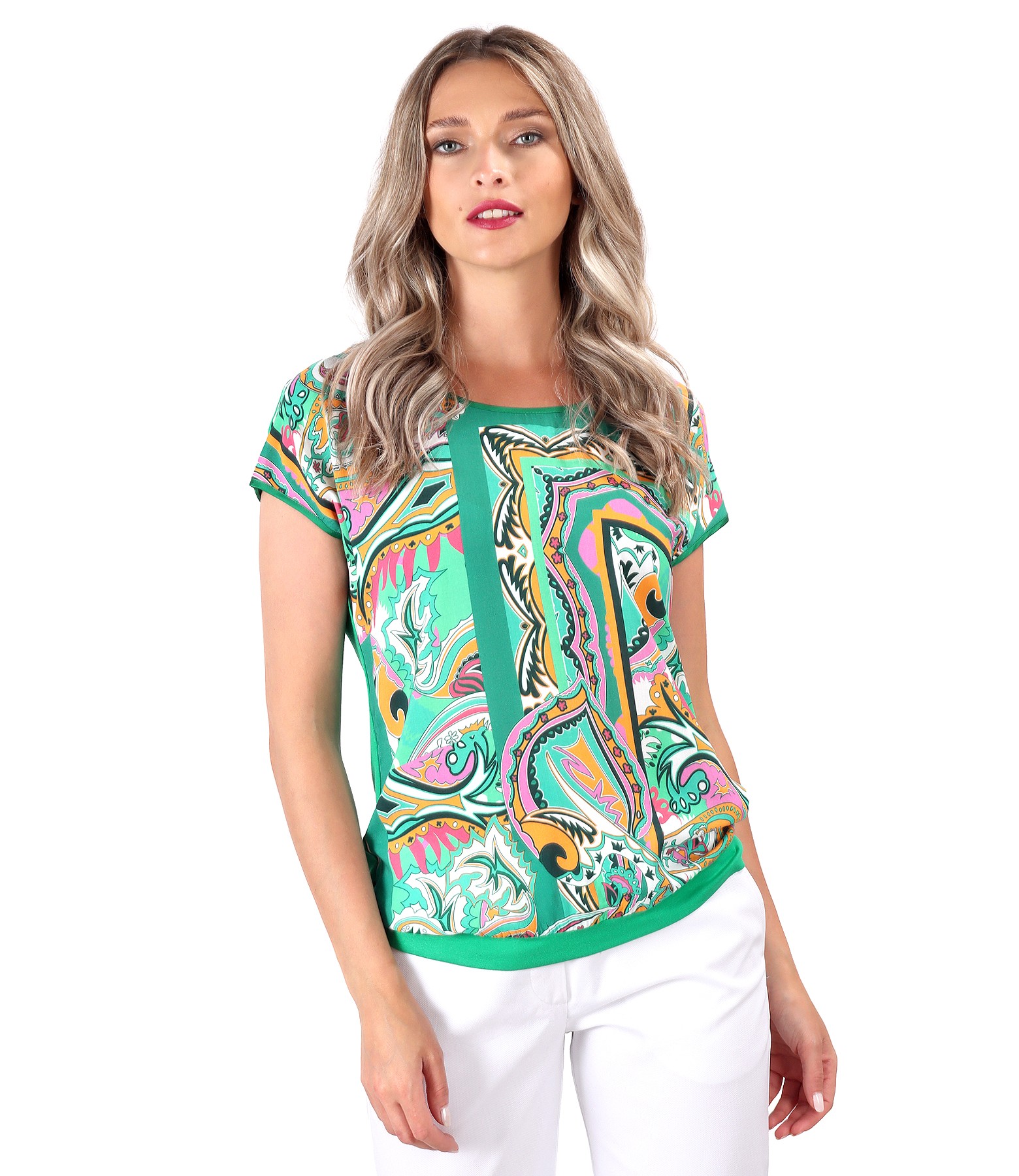 Elastic jersey blouse, with viscose front printed with floral motifs, with round neckline and dropped sleeves. The print position varies by product.