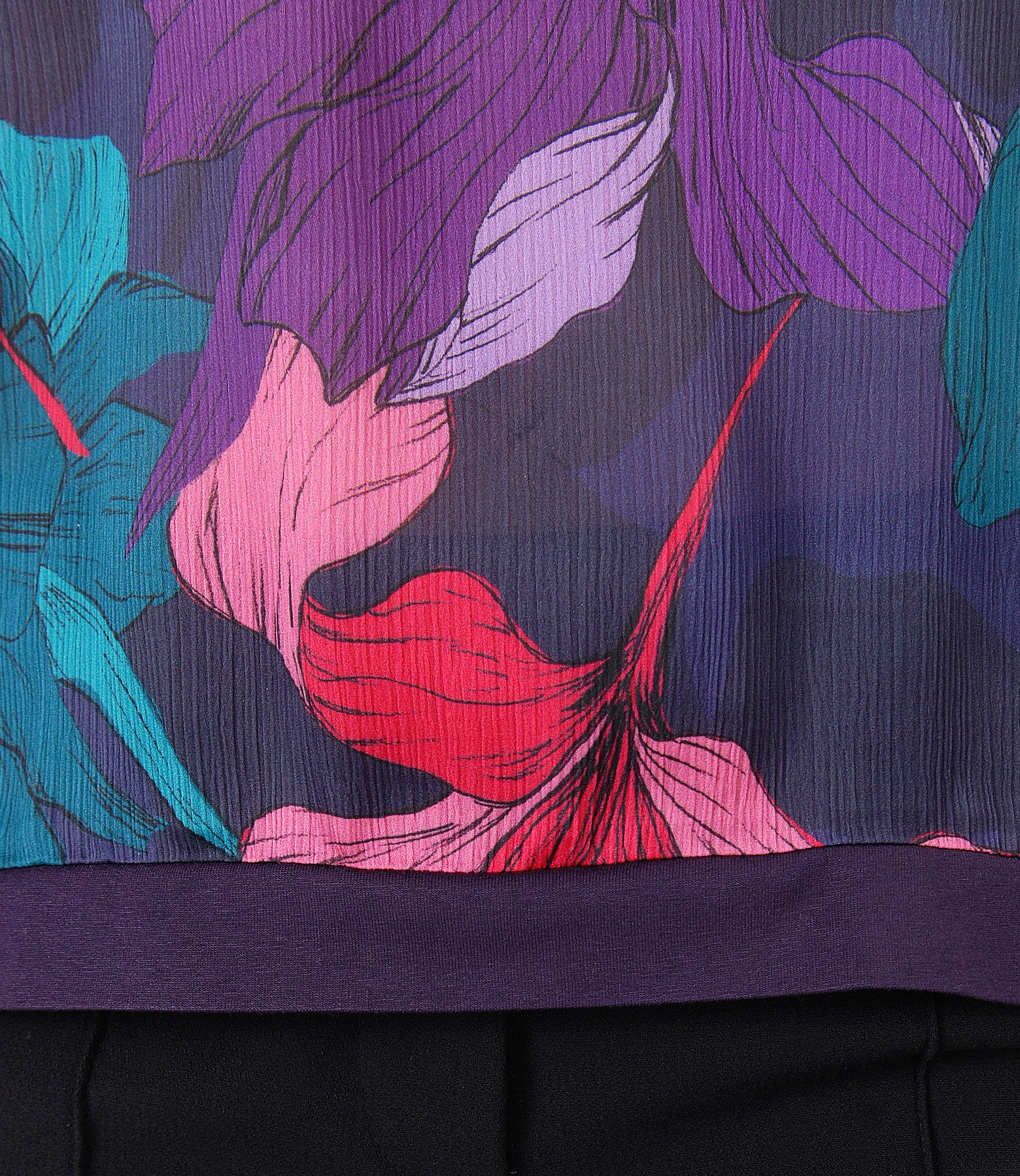 Elastic jersey blouse, with veil front and floral print, round low-cut neck and draping sleeves.