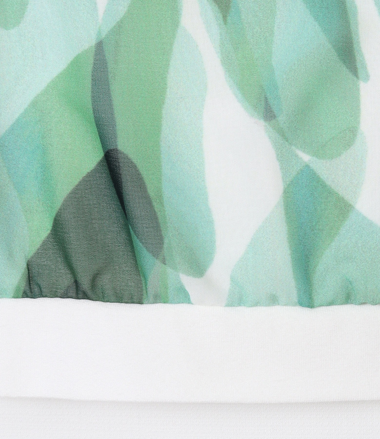 Blouse with veil front printed with floral motifs,padded with viscose veil,back made of uni elastic jersey.It has a round neckline and dropped sleeves.