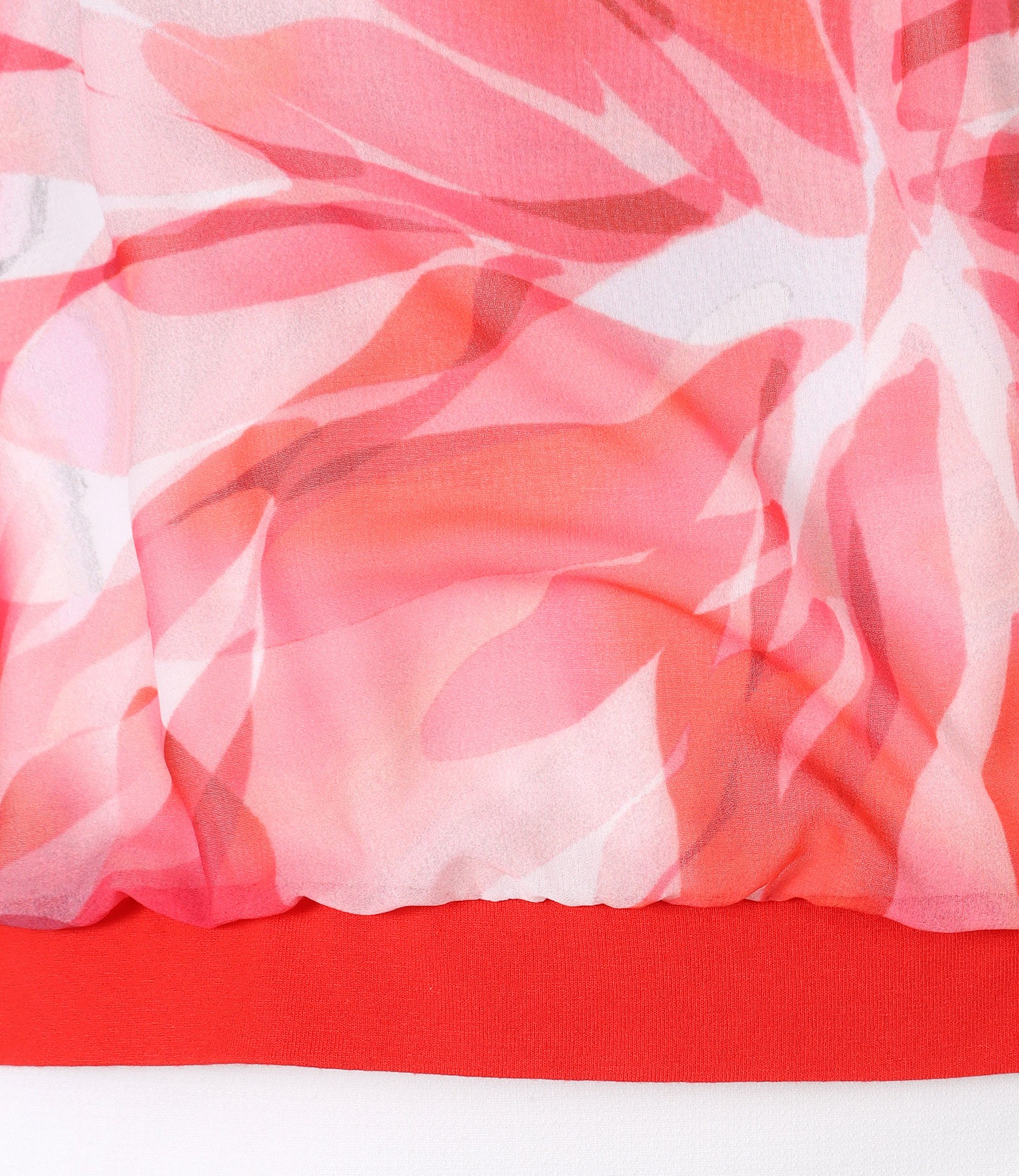 Blouse with veil front printed with floral motifs,padded with viscose veil,back made of uni elastic jersey.It has a round neckline and dropped sleeves.