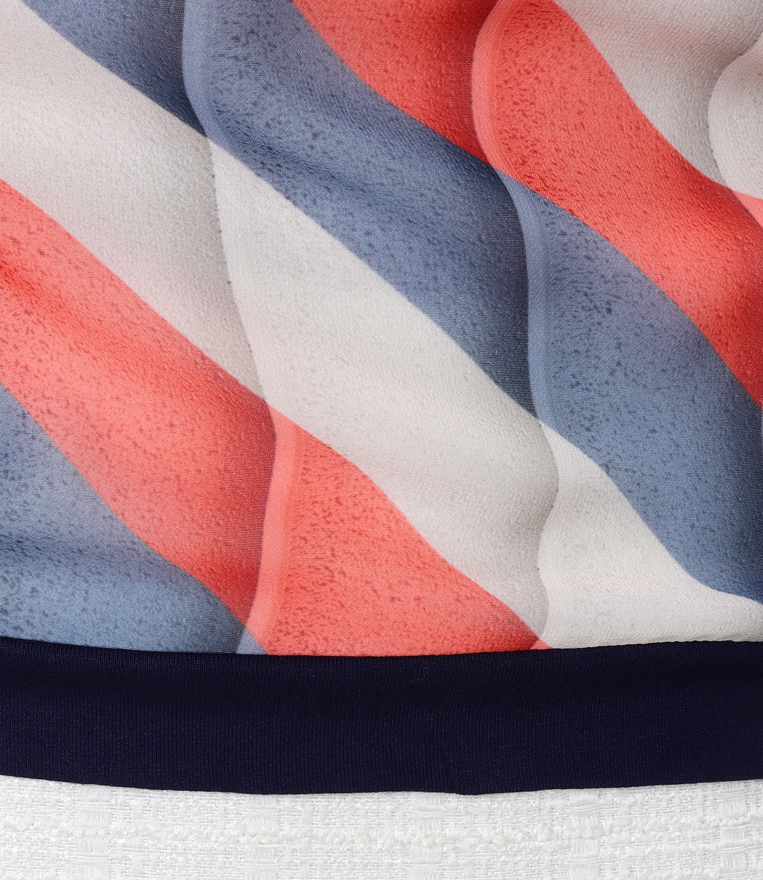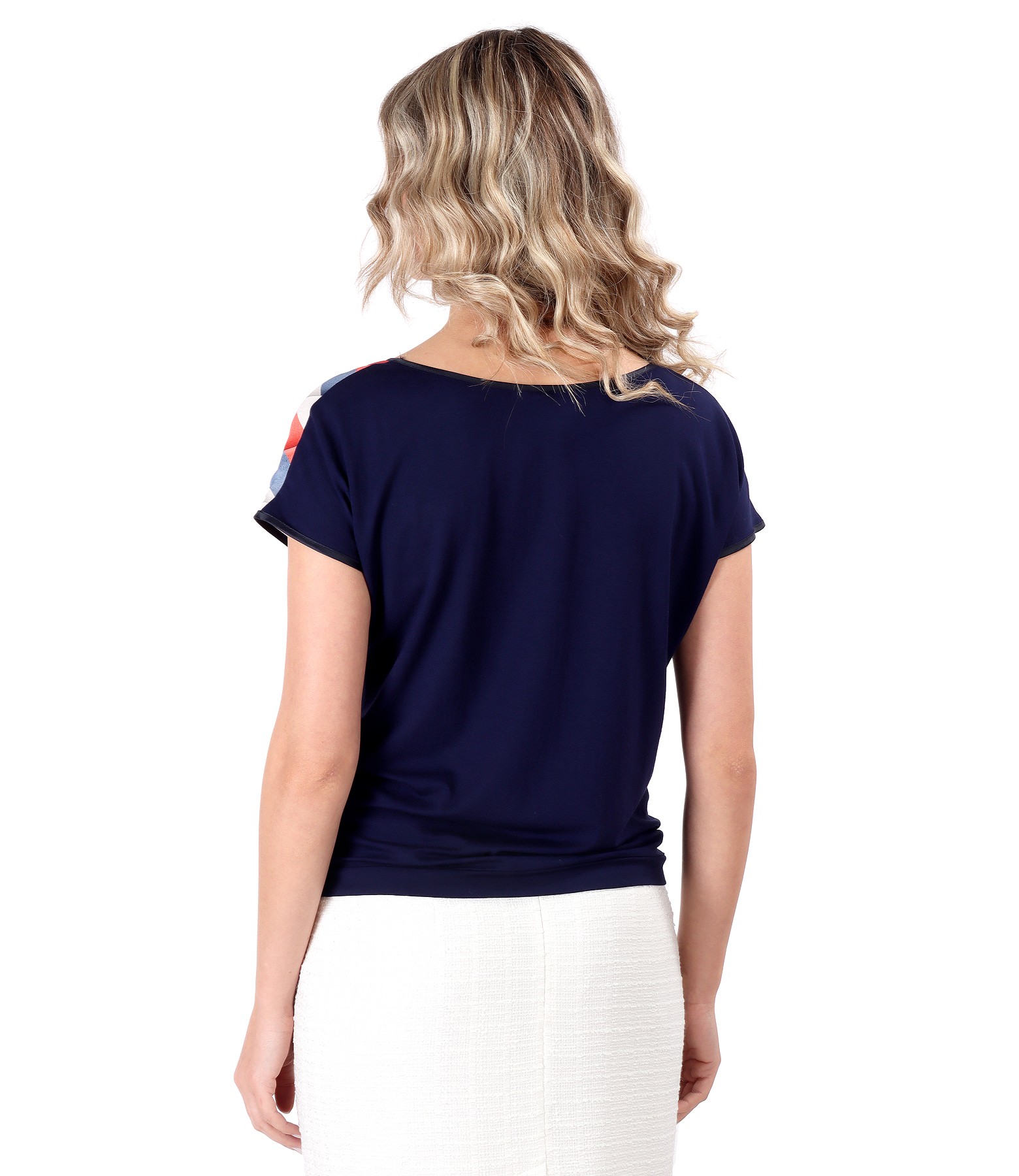 Elastic jersey blouse,with veil front printed with stripes, with round neckline and draped sleeves.