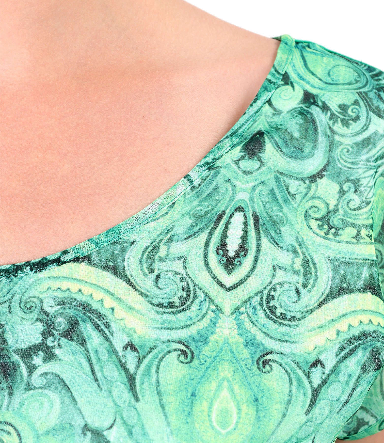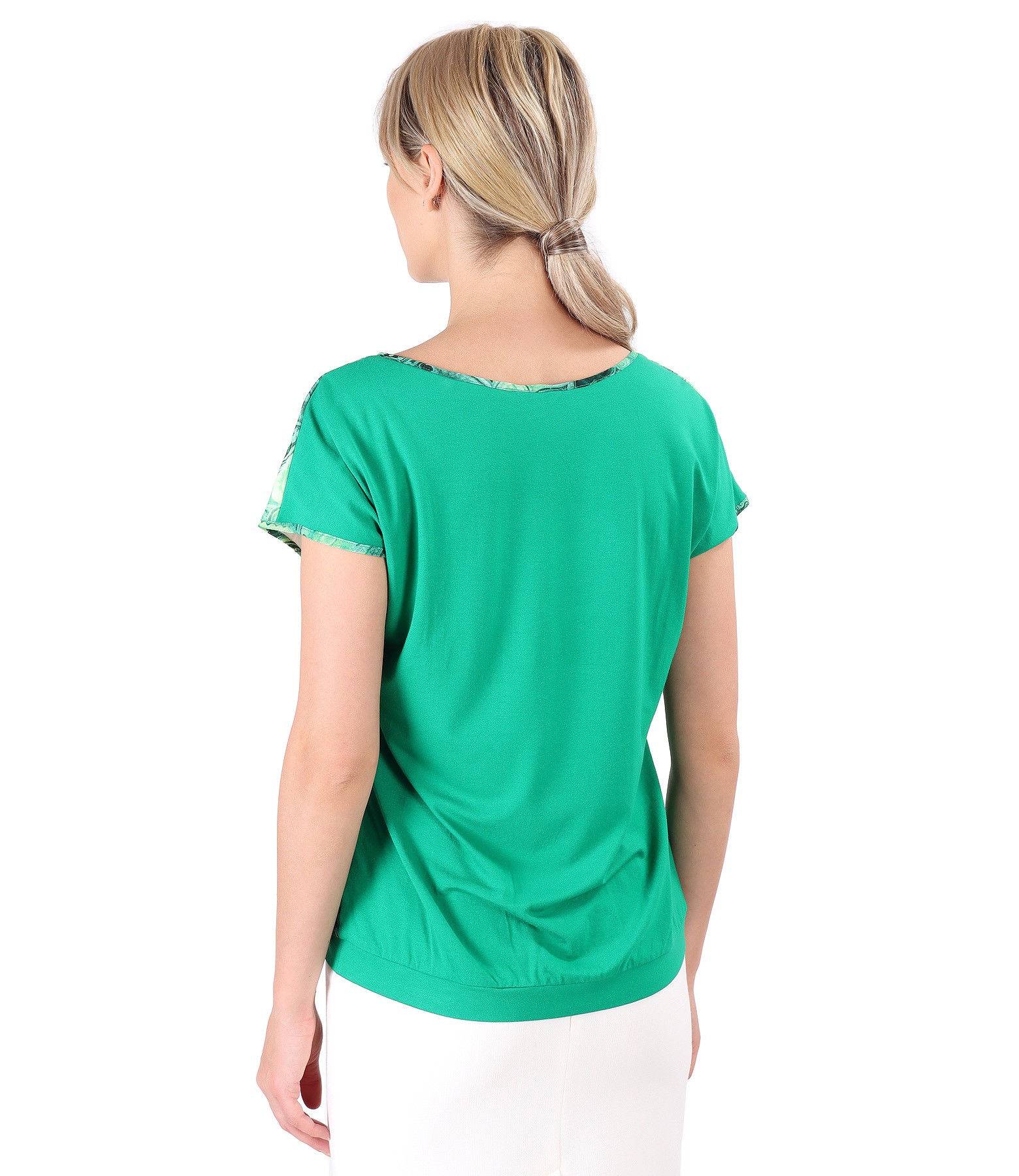 Elastic jersey blouse, with veil front printed with floral motifs, with round neckline and dropped sleeves.