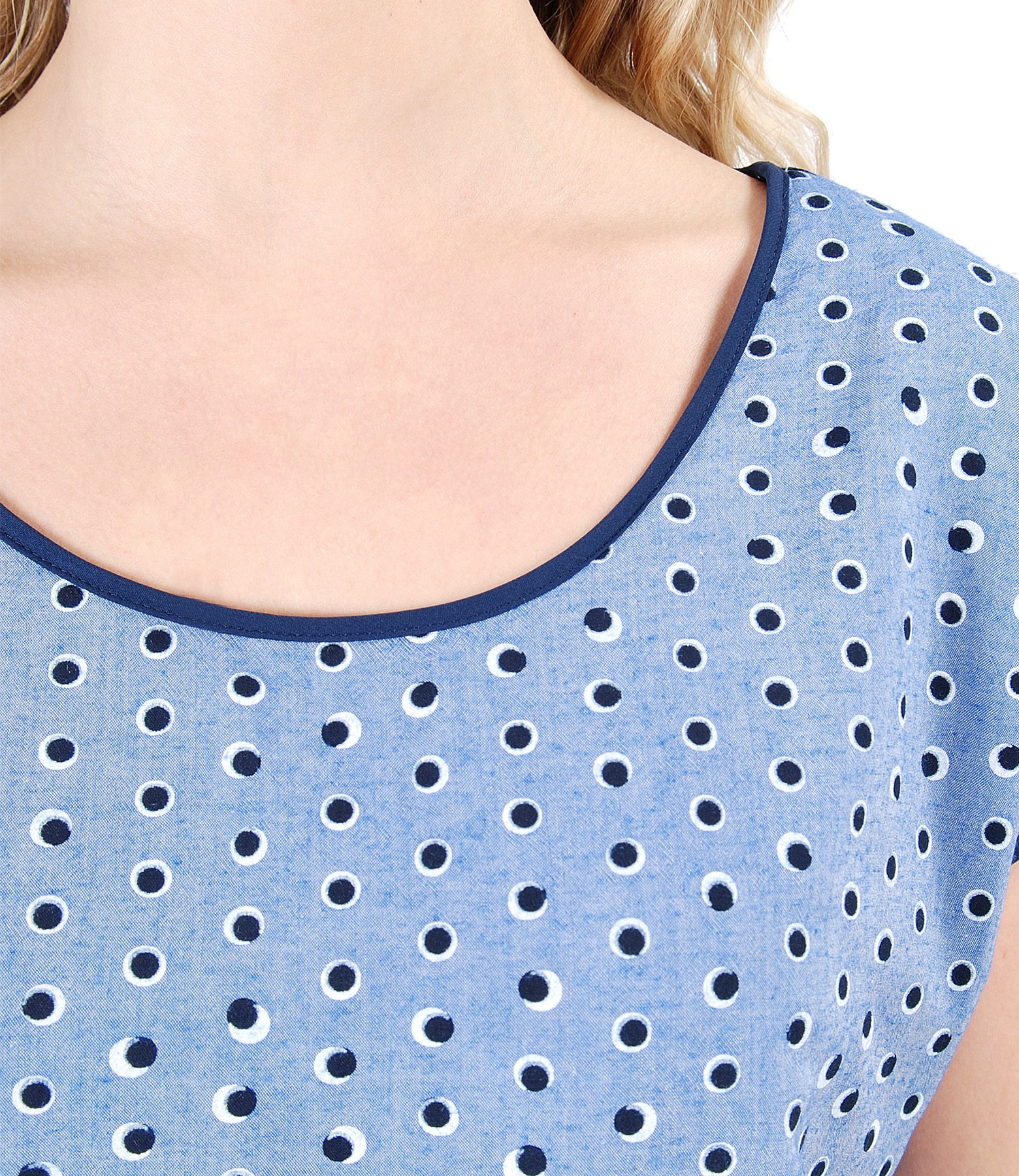 Elastic jersey blouse, with viscose front printed with dots, deep low-cut neck and draping sleeves.
