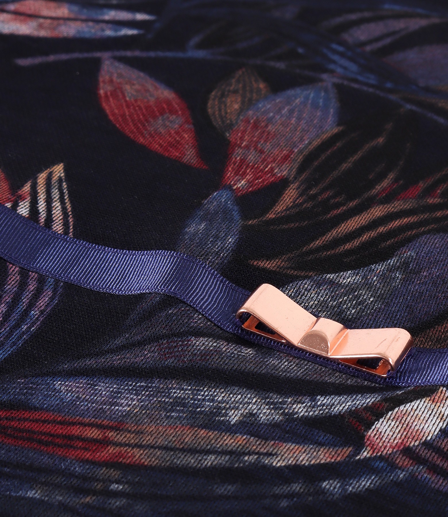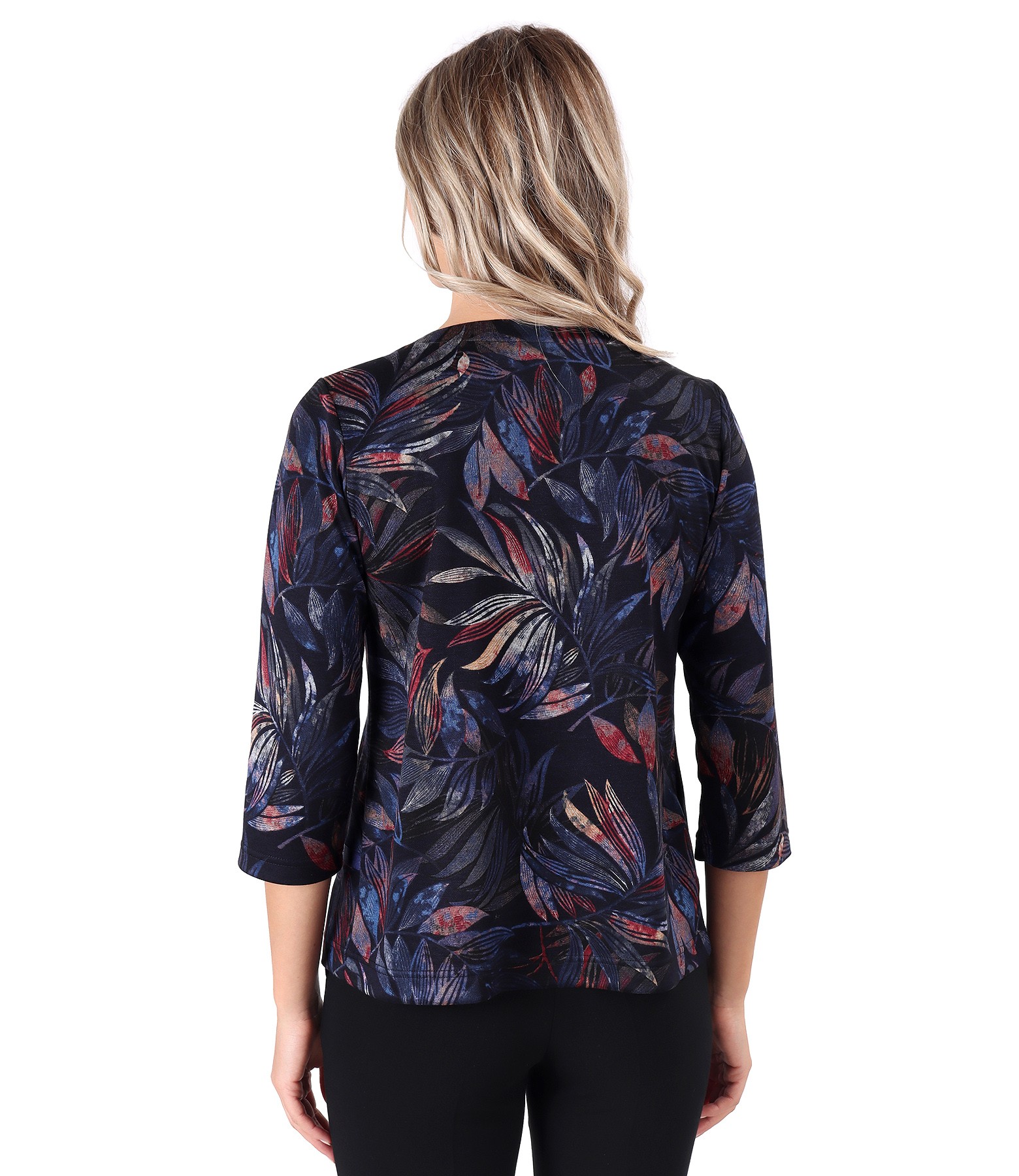 Bluza din jerse elastic gros imprimat cu motive florale, cu maneci 3/4, decolteu rotund si banda din rips cu funda metalica pe fata.