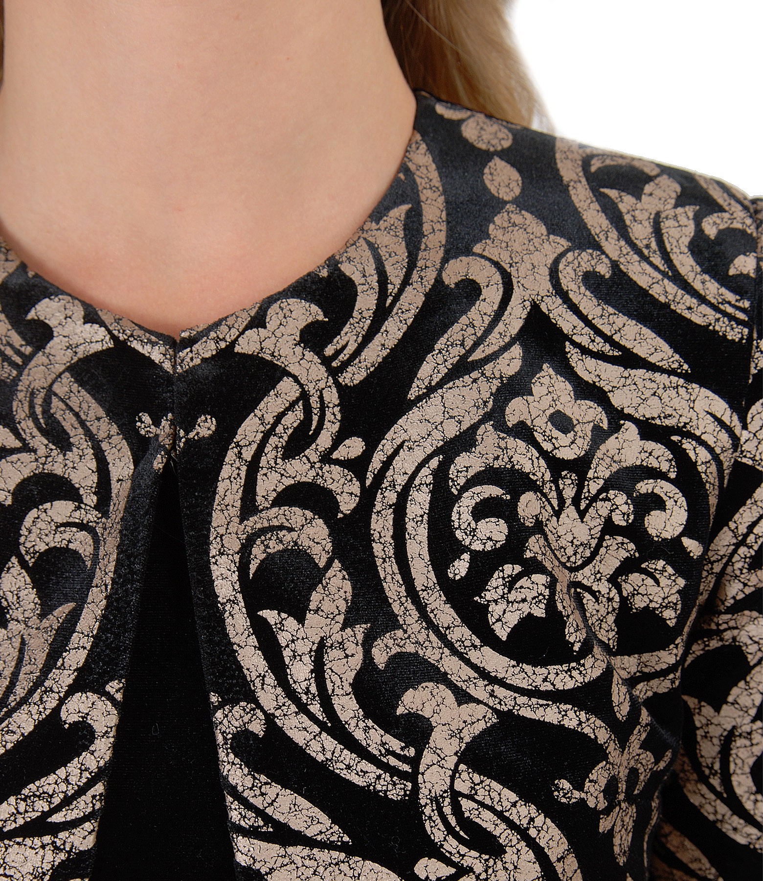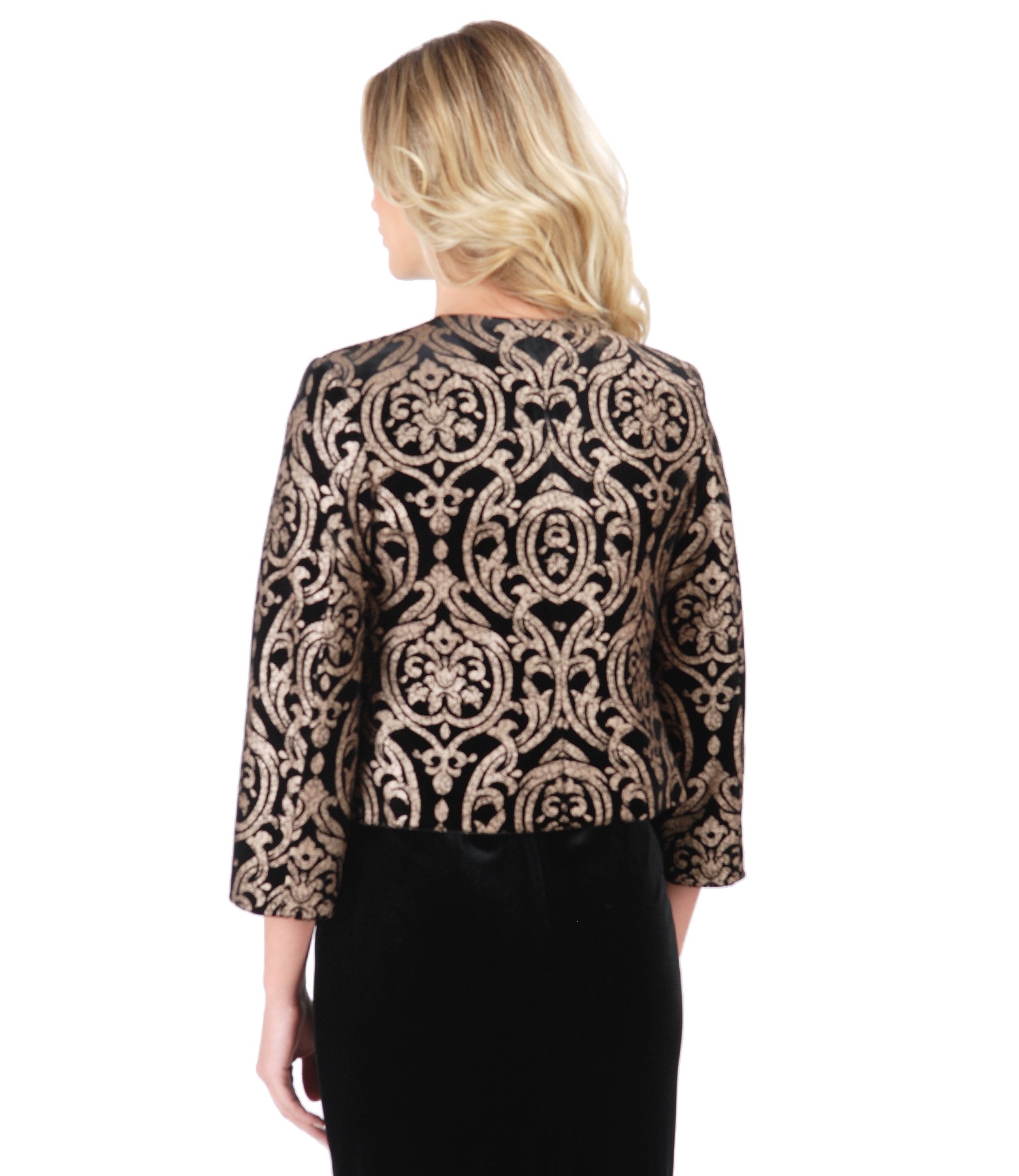 Bolero din catifea elastica imprimata cu motive aurii, captusit si cu maneci lungi. Se inchide cu 2 capse mos-baba in partea superioara.