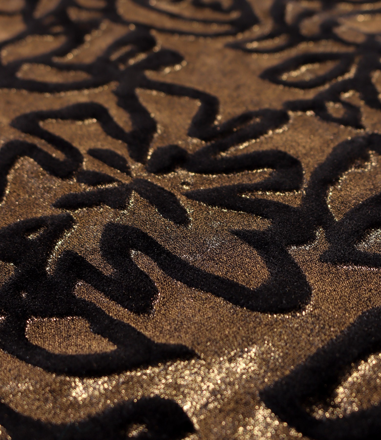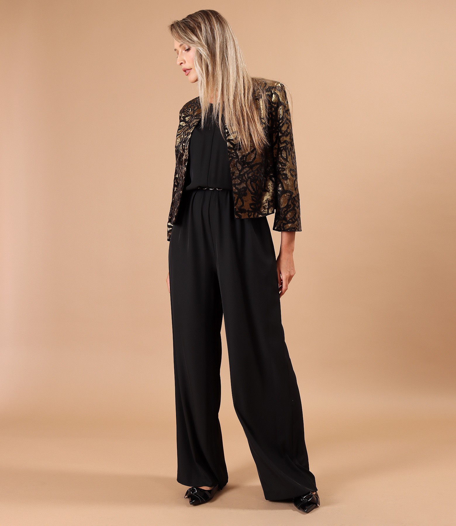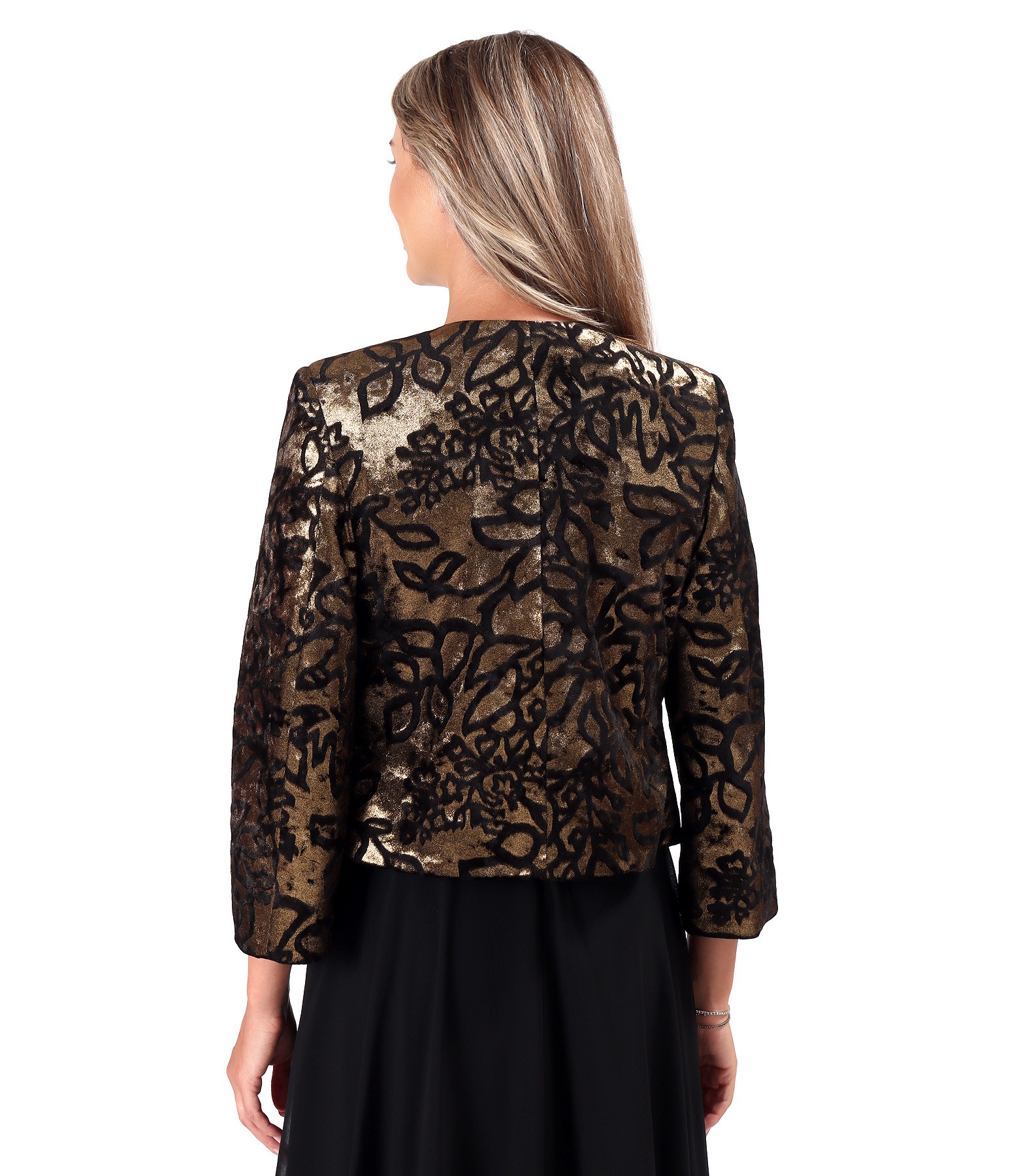 Bolero made of elastic velvet printed with golden motifs, lined, with 3/4 sleeves. Fastens with two hook-and-eye closures at the top.