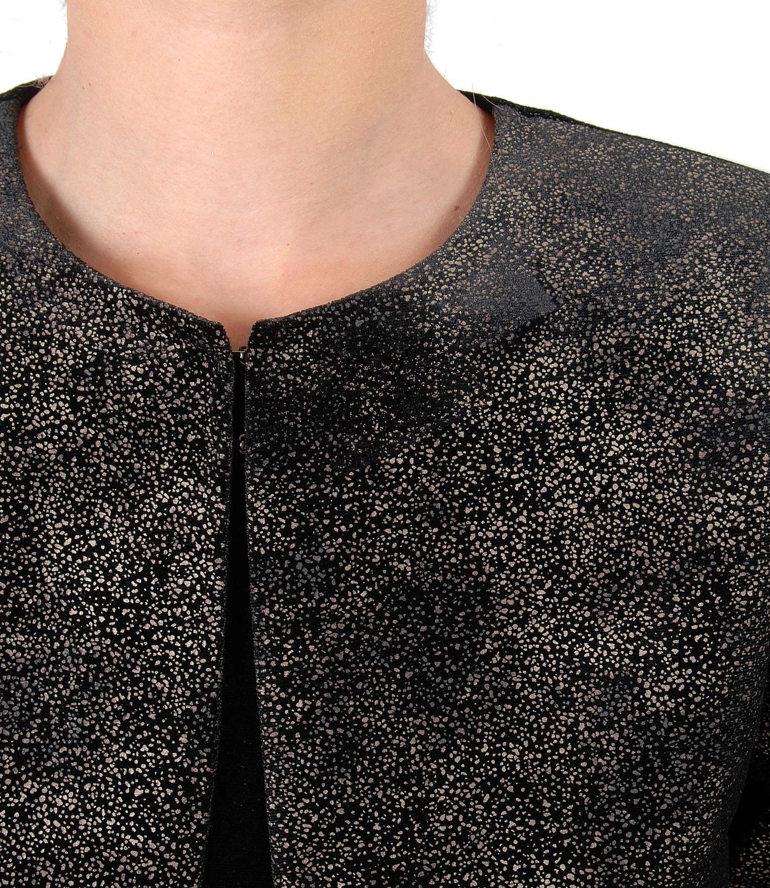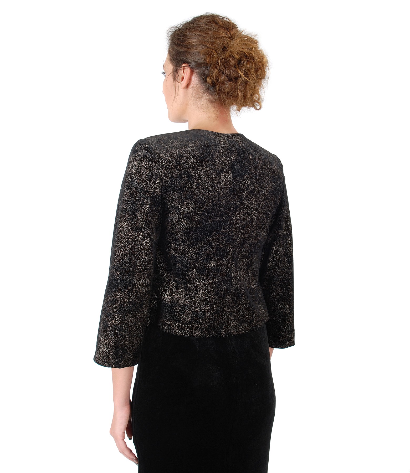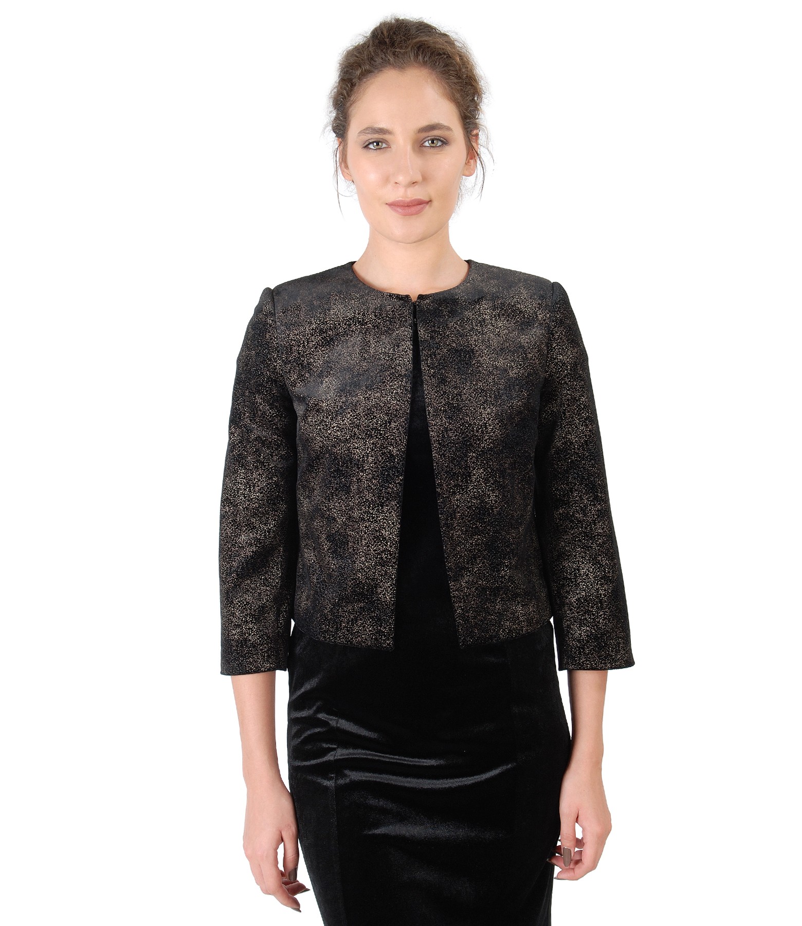 Bolero made of printed elastic velvet, with golden motifs, padded, with 3/4 sleeves. Closes with 2 staples.