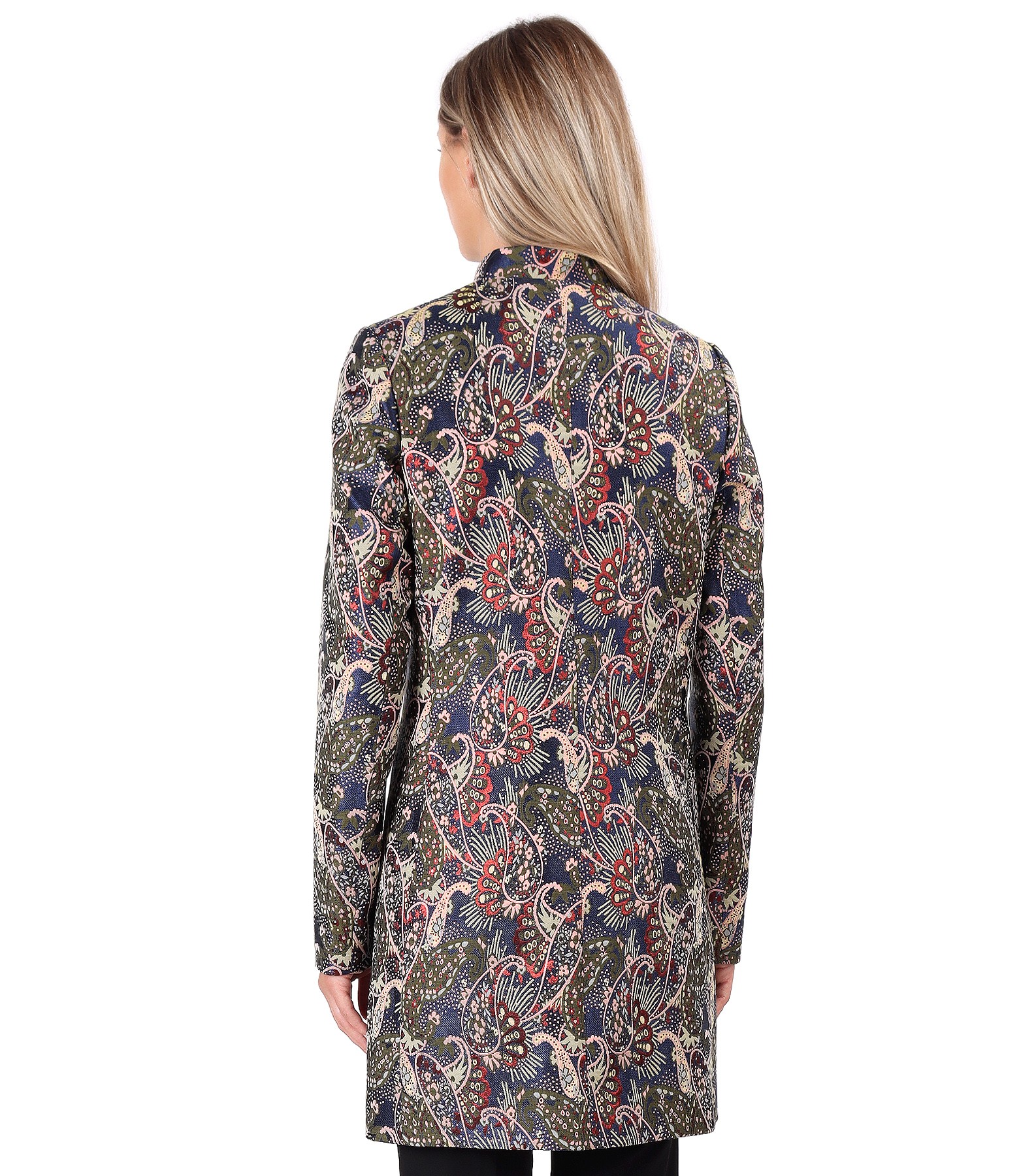 Brocade jacket with metallic thread and paisley motifs, padded, with collar like tunic, with a neckline around the neck and with two side pockets. Closes on the face with 5 staples up to the base of the neck.