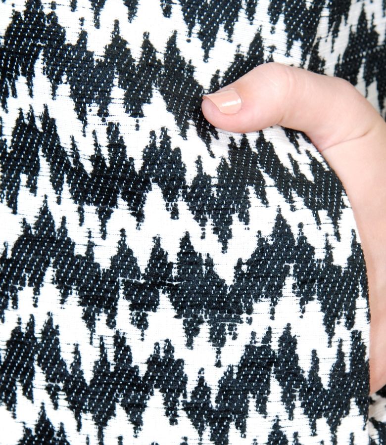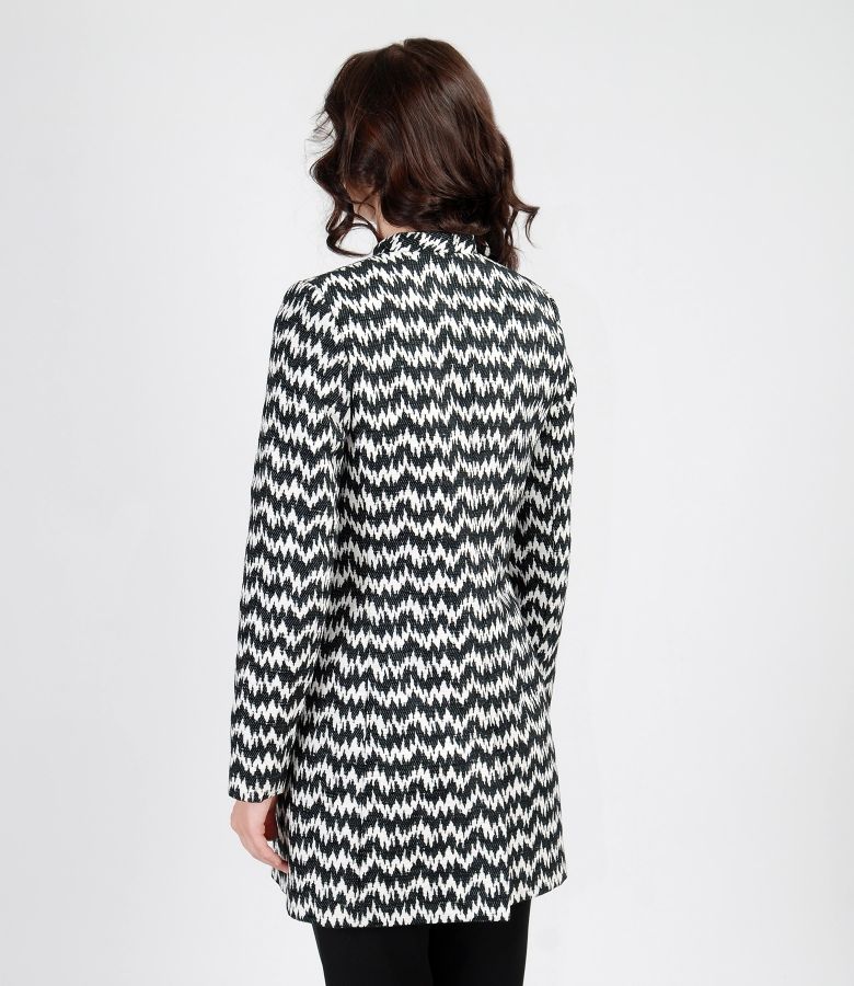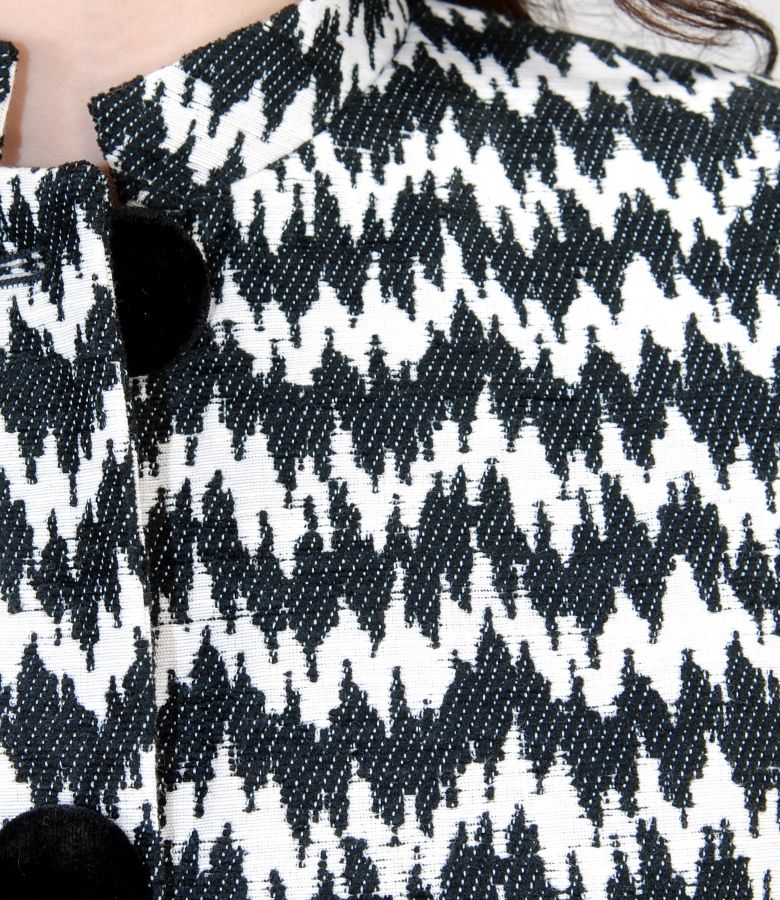 Brocade jacket with velvet, without collar, with alongside-neck clevage. Two hidden side pockets, overlapped slit. Closes to the base of the neck with 5 velvet dressed buttons.