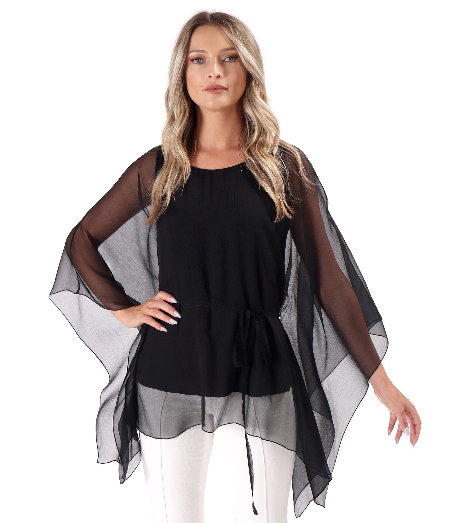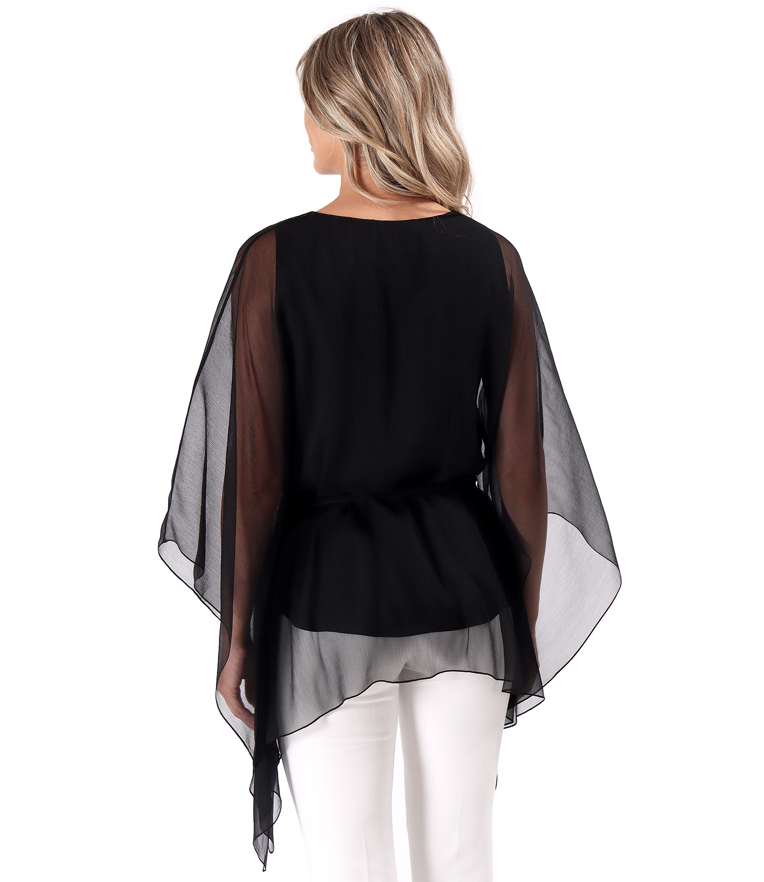 Butterfly blouse made of natural silk voile, padded with viscose, round neckline, and drawstring at the waist.